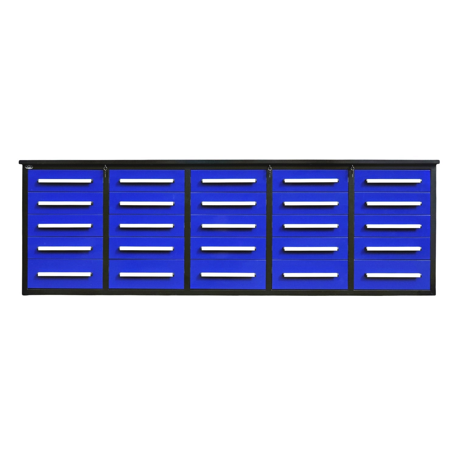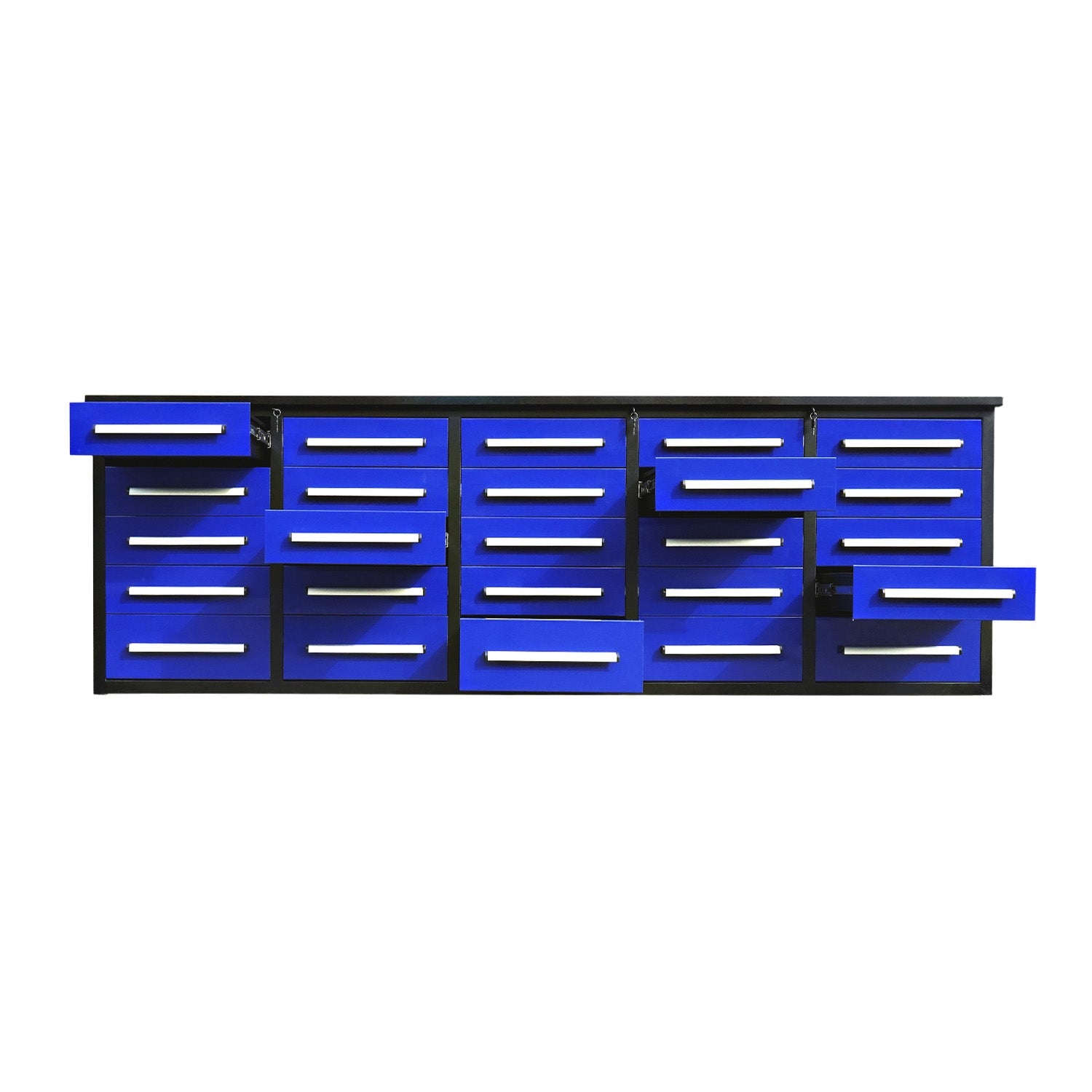 This 10ft workbench with 25 storage drawers is designed for industrial purposes. You can easily place it in your workshop, garage, basement, or laboratory. This is a bigger version of 7' Garage Storage Cabinets with Workbench (20 Drawers) with a longer length and more space to keep belongings safe and organized. Each drawer is equipped with an anti-slip mat, so you can find the supply exactly where you put it. Length in 10 ft is more suitable for a large space, and colors in red and blue deliver a message that this product is professional and reliable.