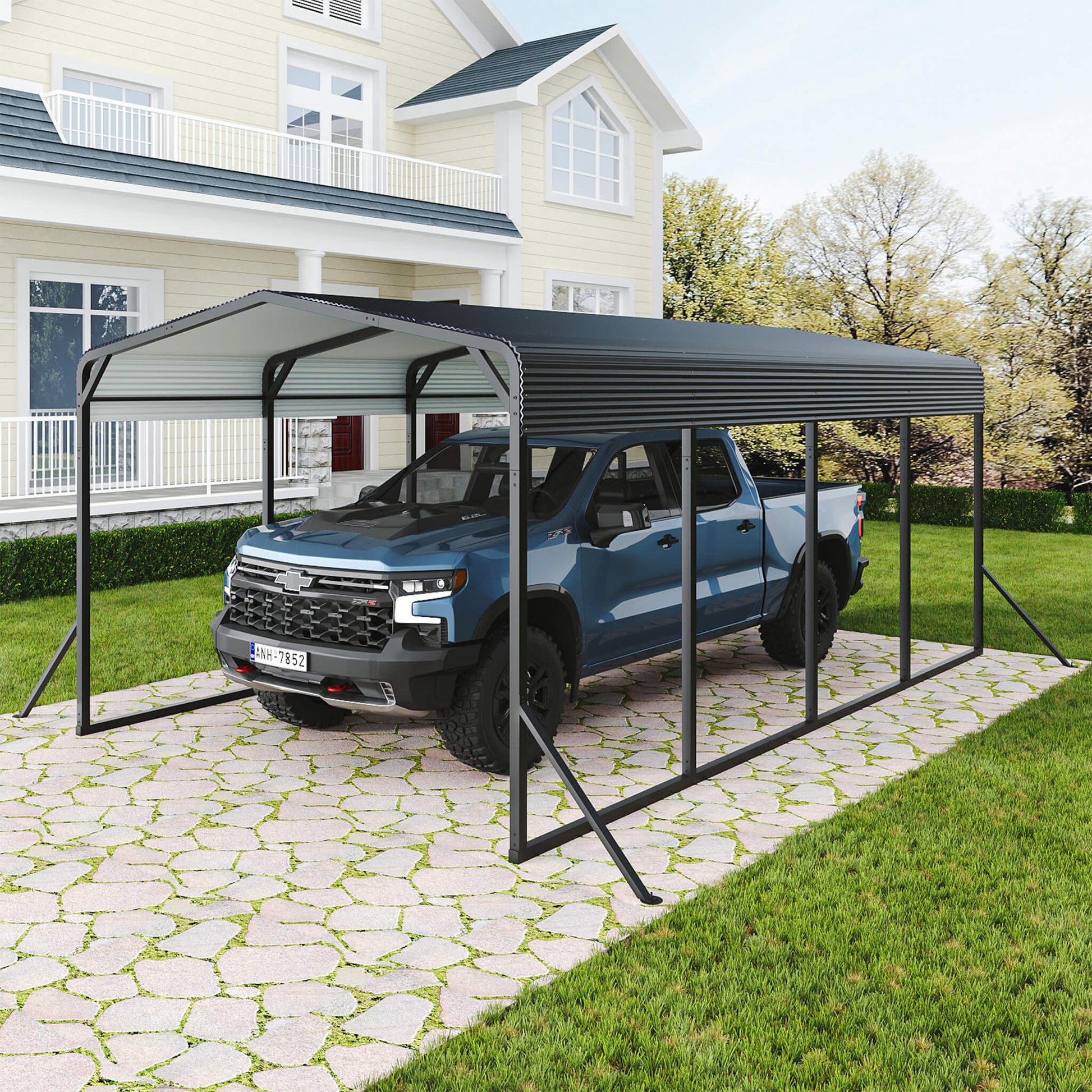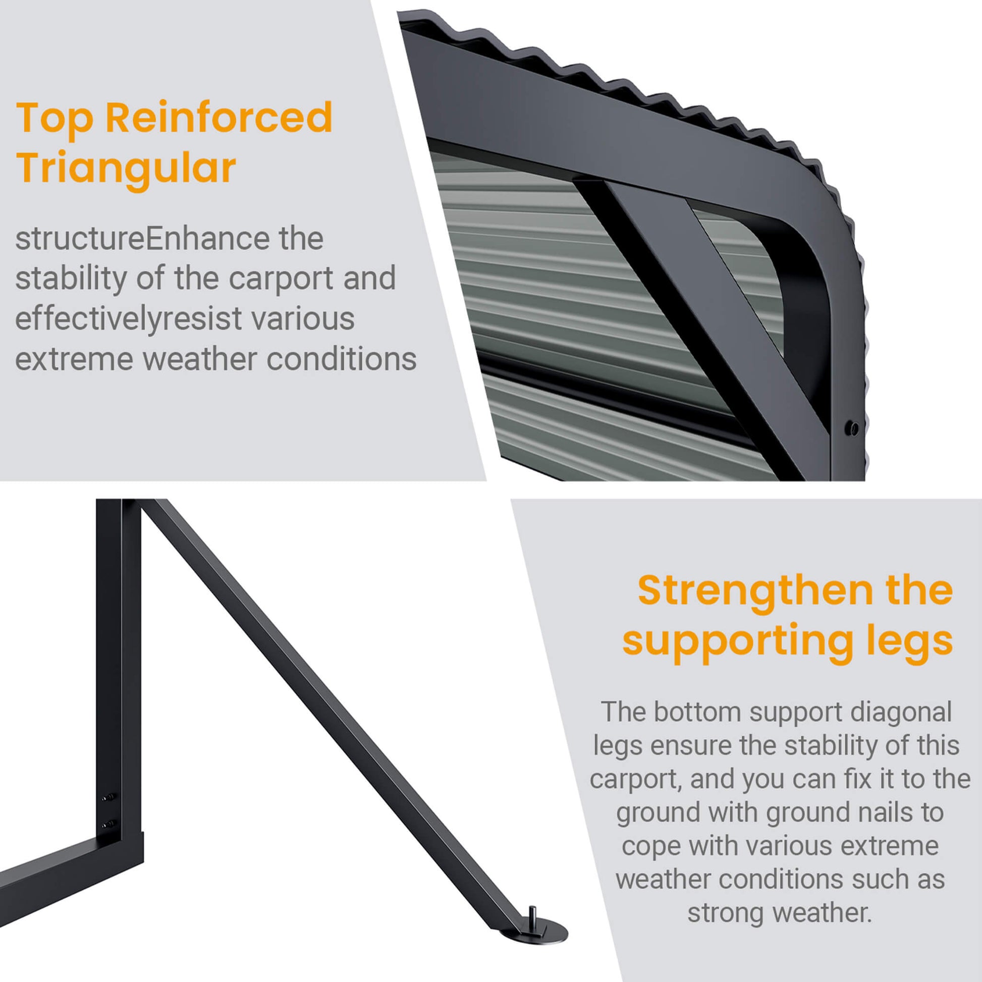 - Heavy-duty metal carport built with reinforced steel pipes and advanced compression technology for maximum strength. Features extra support beams top and bottom to withstand harsh weather and wind. Reliable protection for your vehicles, designed to last.