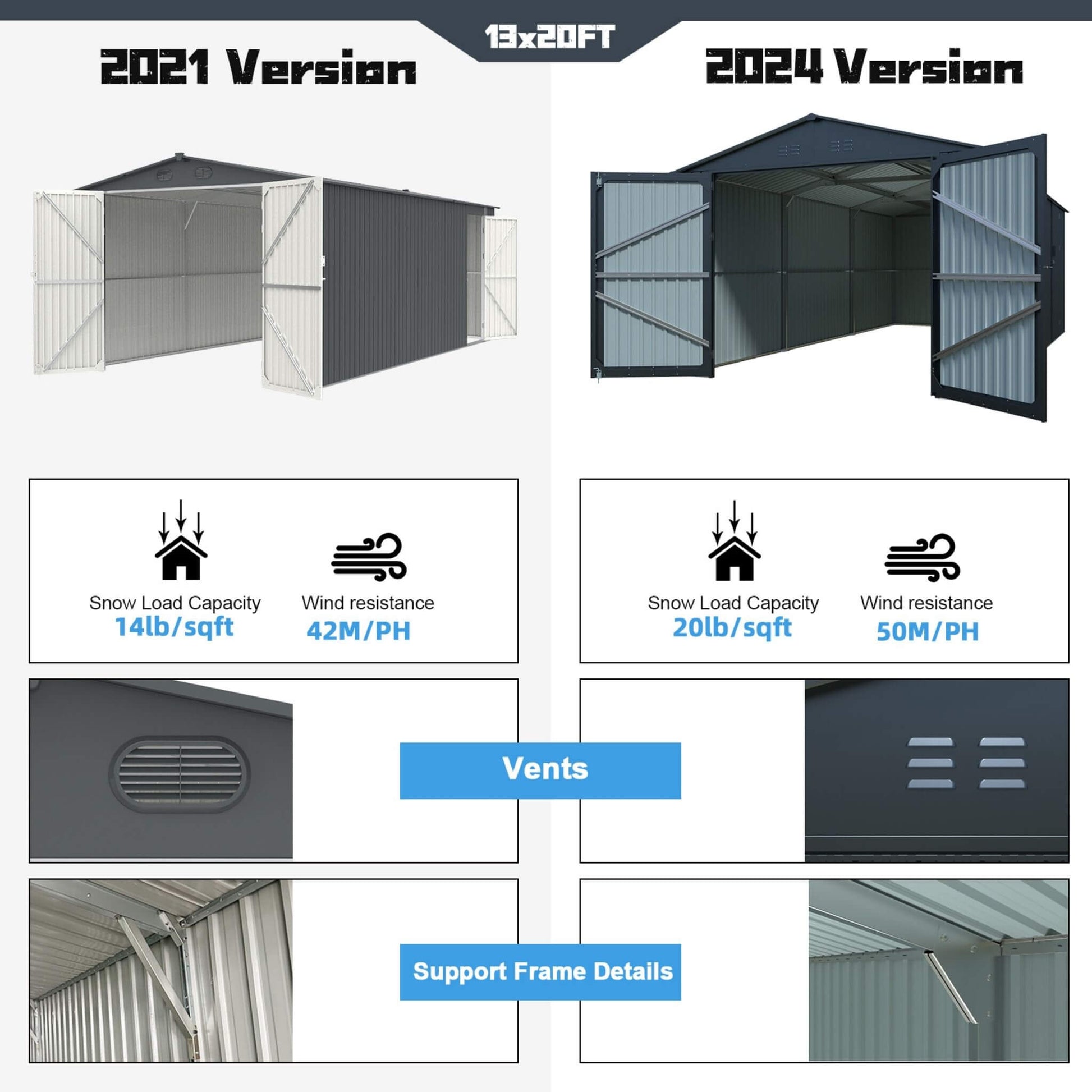 - This massive 13x20 ft shed features a large, hinged double front door for driving in vehicles and a separate side door for quick walk-in access, making it incredibly easy to store and retrieve large items like trucks, lawnmowers, and more.