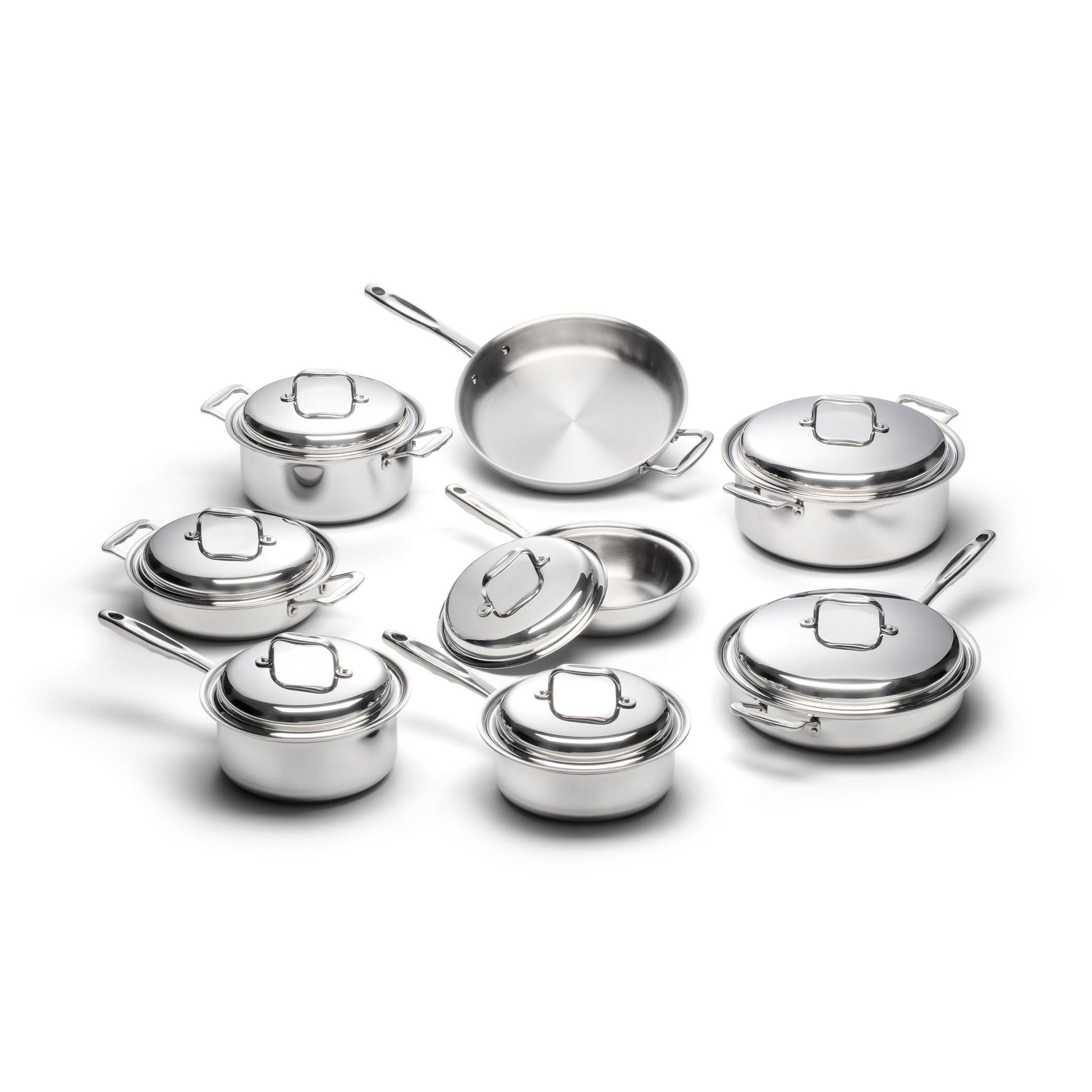 8"Covered Fry Pan, 2 Quart Saucepan with Cover, 3 Quart Saucepan with Cover, 2.3 Quart Casserole Pan with Cover, 3.5 Quart Sauté Pan with Cover, 4 Quart Stock Pot with Cover, 6 Quart Slow Cooker Stock Pot with Cover, 11.5" Fry Pan, FREE SLOW COOKER BASE, FREE Stainless Steel Cleaner, Use & Care Guide and Certificate of Authenticity.