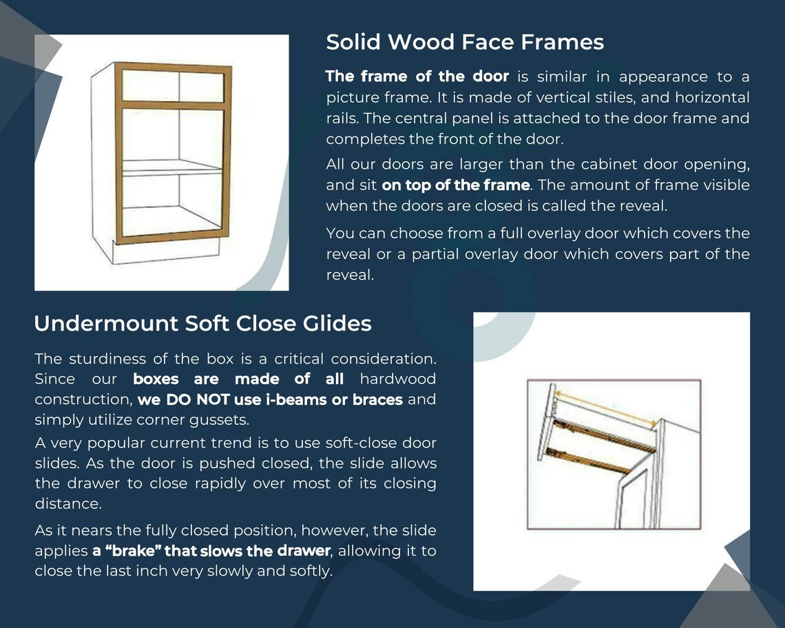 *You or your contractor will be responsible for assembling the cabinets. Instructions are included and the assembly is straight forward with the doors already attached to the face frame with soft closing European adjustable hinges.