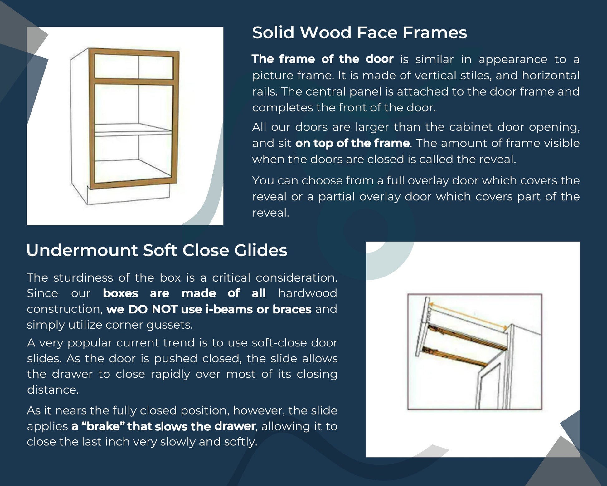 The frame of the door is similar in appearance to a picture frame. It is made of vertical stiles and horizontal rails. The solid wood doors are attached to the door frame with soft close adjustable European hinges. All our doors are larger than the cabinet door opening and sit on top of the frame for a full overlay design.