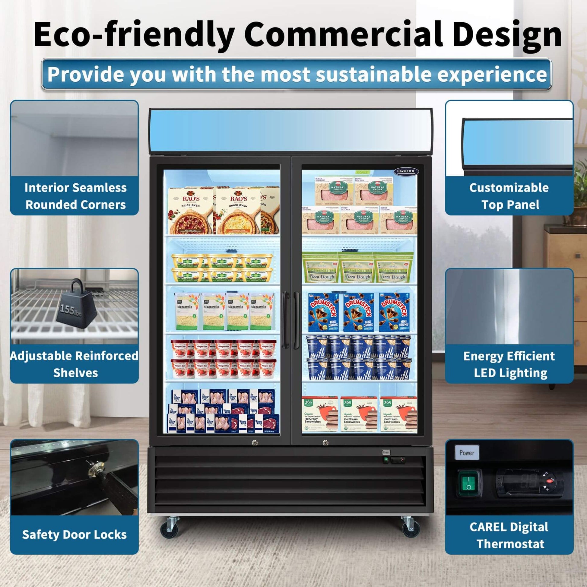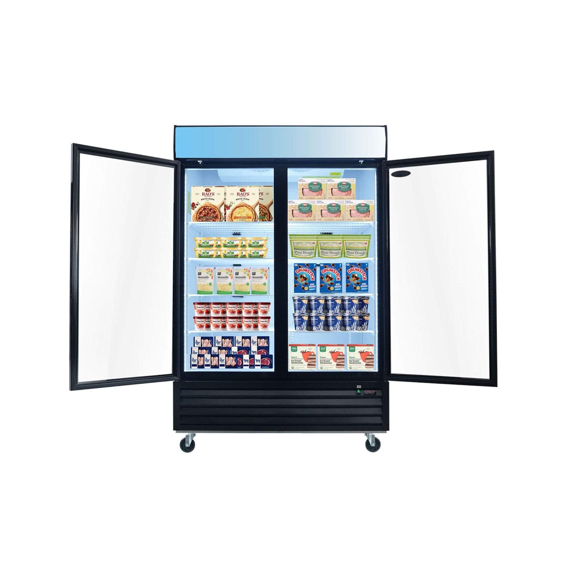 Showcase your best-selling frozen treats with absolute confidence using this spacious 44.7 Cu.Ft Commercial Glass Door Merchandiser Freezer. Designed to grab customer attention instantly, the brilliant energy-efficient LED lighting illuminates every product on the eight adjustable shelves, making your merchandise impossible to miss. The customizable top panel gives you a prime spot to feature your brand logo, ensuring your business stands out the moment someone walks into your establishment.