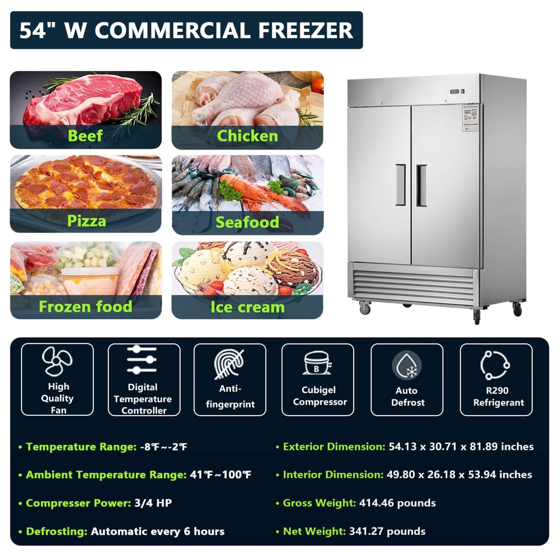 Keep your ingredients perfectly preserved with our 54-Inch Commercial Stainless Steel Reach-In Freezer, engineered for the demanding pace of any commercial kitchen! Its intelligent temperature control system maintains a consistent -8°F to -2°F, locking in flavor and nutrients with a high-performance, eco-friendly cooling system you can count on.