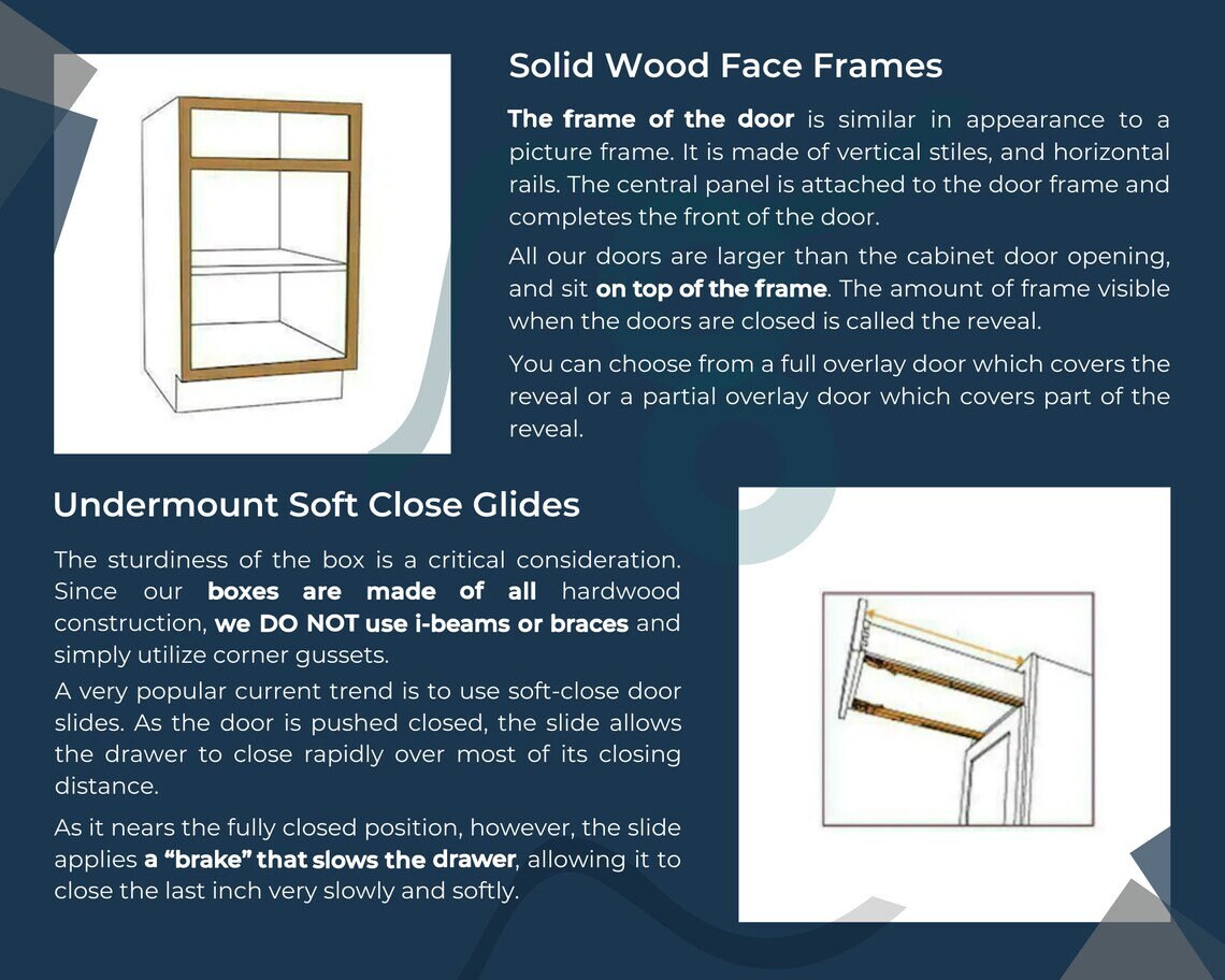 The cabinet drawer boxes use a set of interlocking teeth cut into the board corners to create a strong physical attachment at all four sides of the box. The set of interlocking, tapered teeth cut into the board ends is called a dovetail joint. It is very strong and durable and is considered to be a mark of high quality craftsmanship. The drawers come with sturdy undermount drawer glides that are soft closing just like the doors. By eliminating any chances of slamming the doors and drawers, your vanity will last for years to come.
