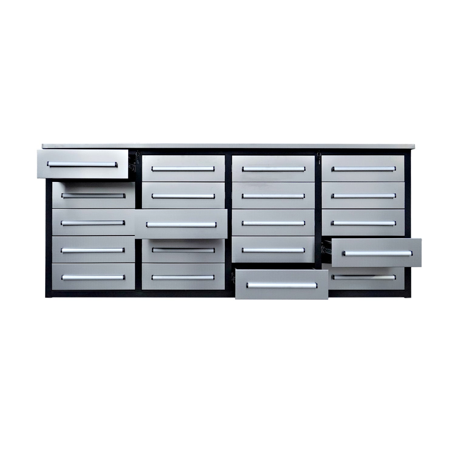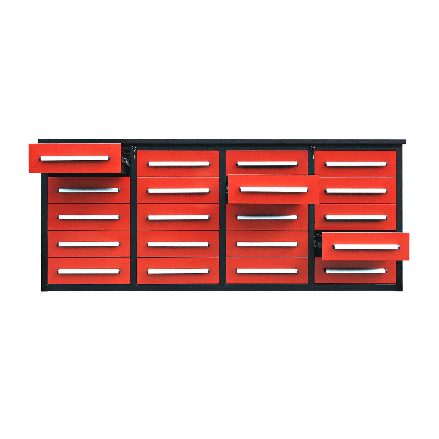 This 7ft garage storage cabinet with a workbench (20 drawers) is perfect for storing your stuff and saving extra space for you. Having 20 drawers with locks means your material in the cabinet is secure and well-protected. Colors in Red, Blue, and black are available, making it suitable for kitchen, basement, garage, laboratory, and industrial applications. You can work with confidence on the workbench top for power tools, mounts, and clamps. This 20-drawer cabinet is a good choice for compartments if you want to find your stuff quickly and with ease.