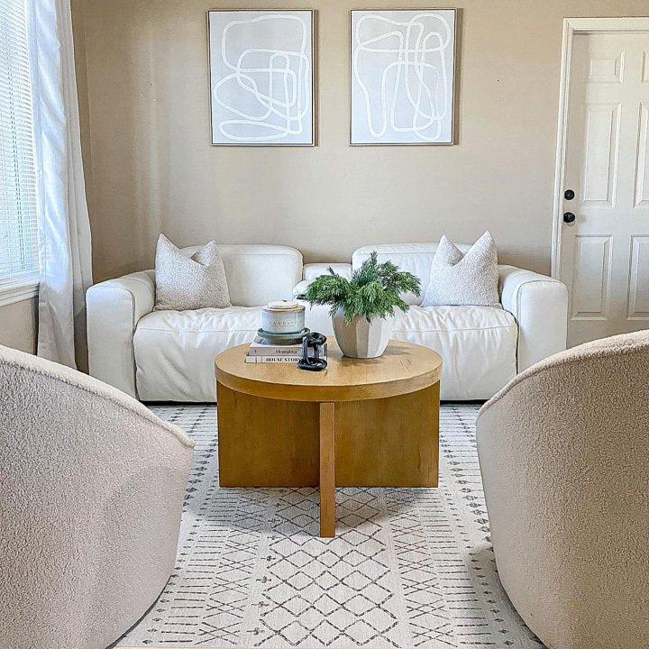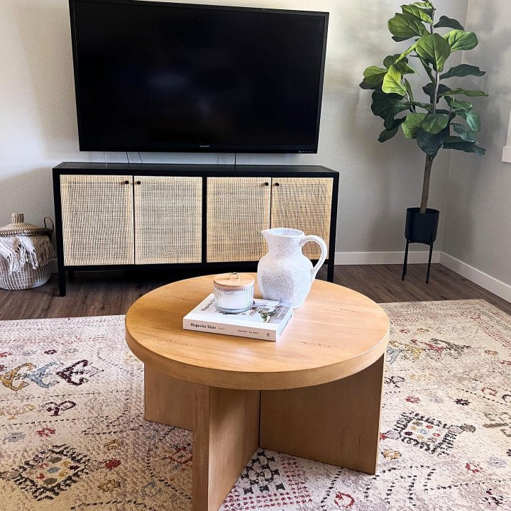 Style up your living room with this Bluff Park Round Wood Coffee Table from Threshold™ designed with Studio McGee. This wooden coffee table features a round tabletop with crisscross legs for simplistic style you'll love adding to your space. Use this round coffee table with the coordinating accent table, and decorate with greenery, books and more for a lively look.