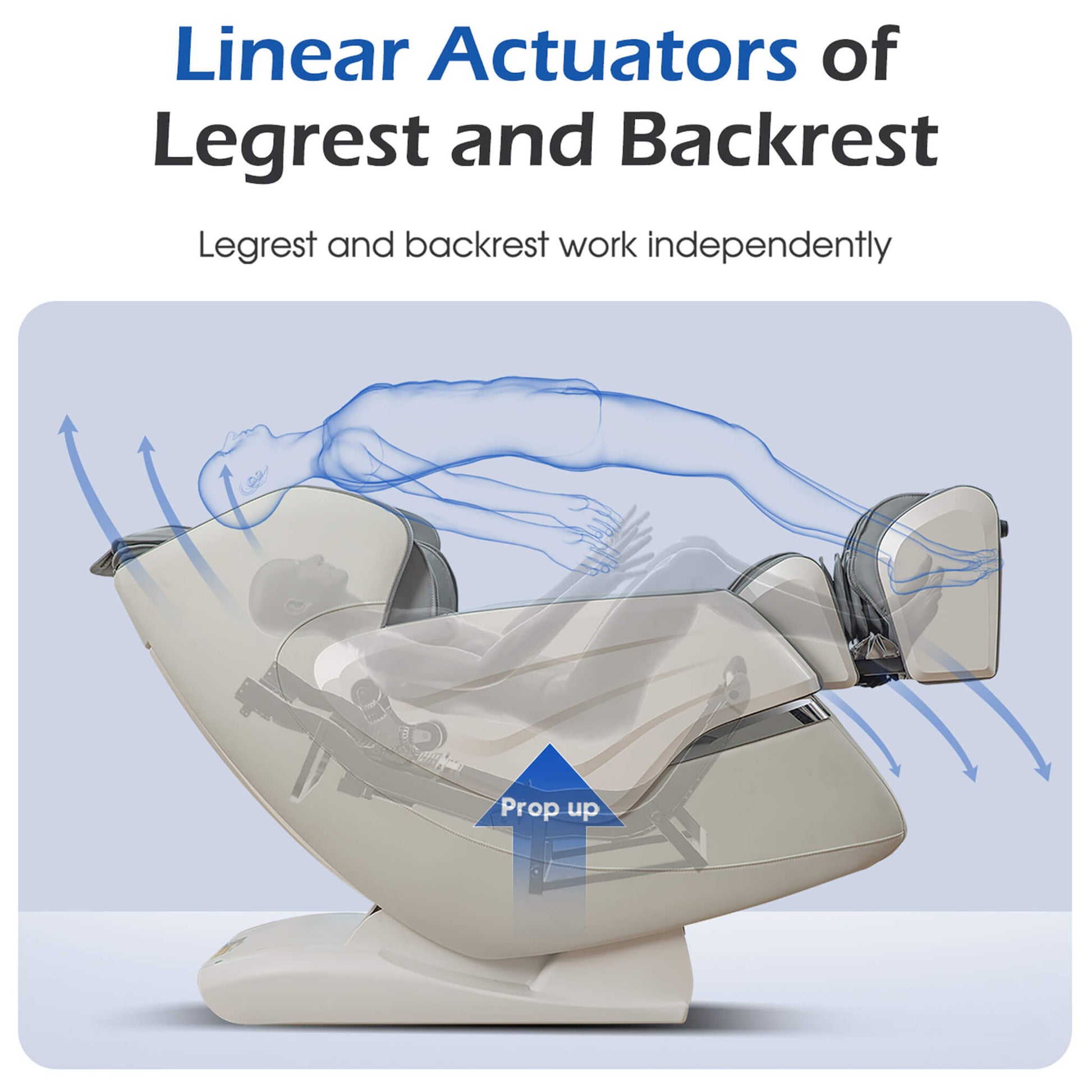 - Equipped with separate linear actuators for the legrest and backrest, this massage chair allows independent adjustment for tailored positioning and focused relaxation, delivering a personalized and revitalizing experience.