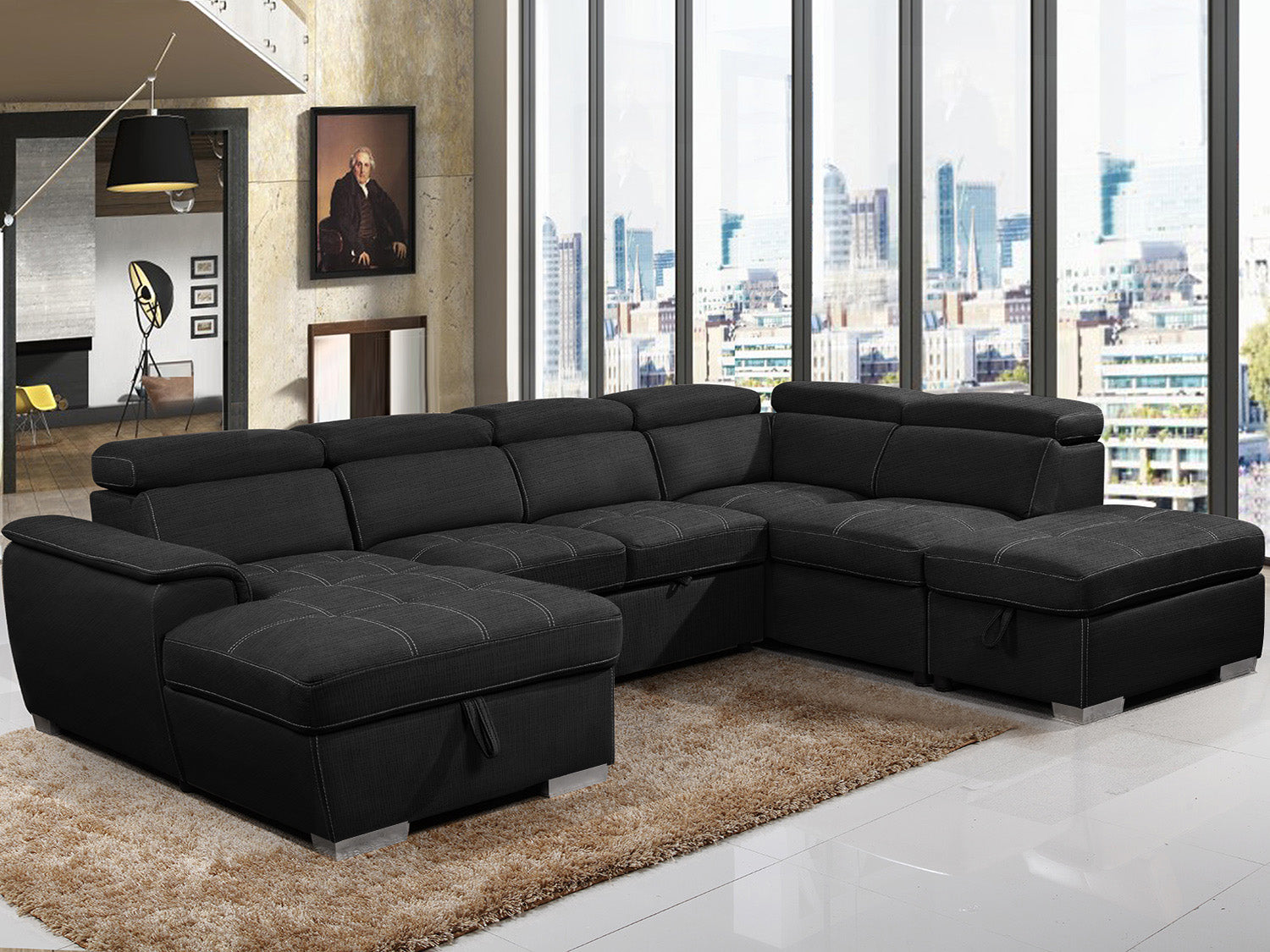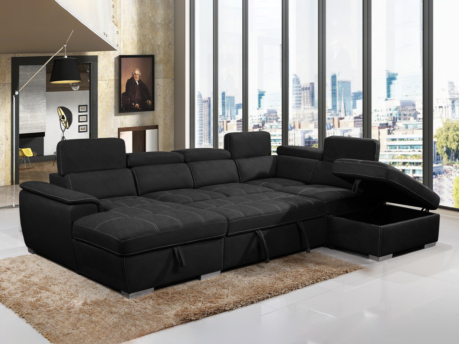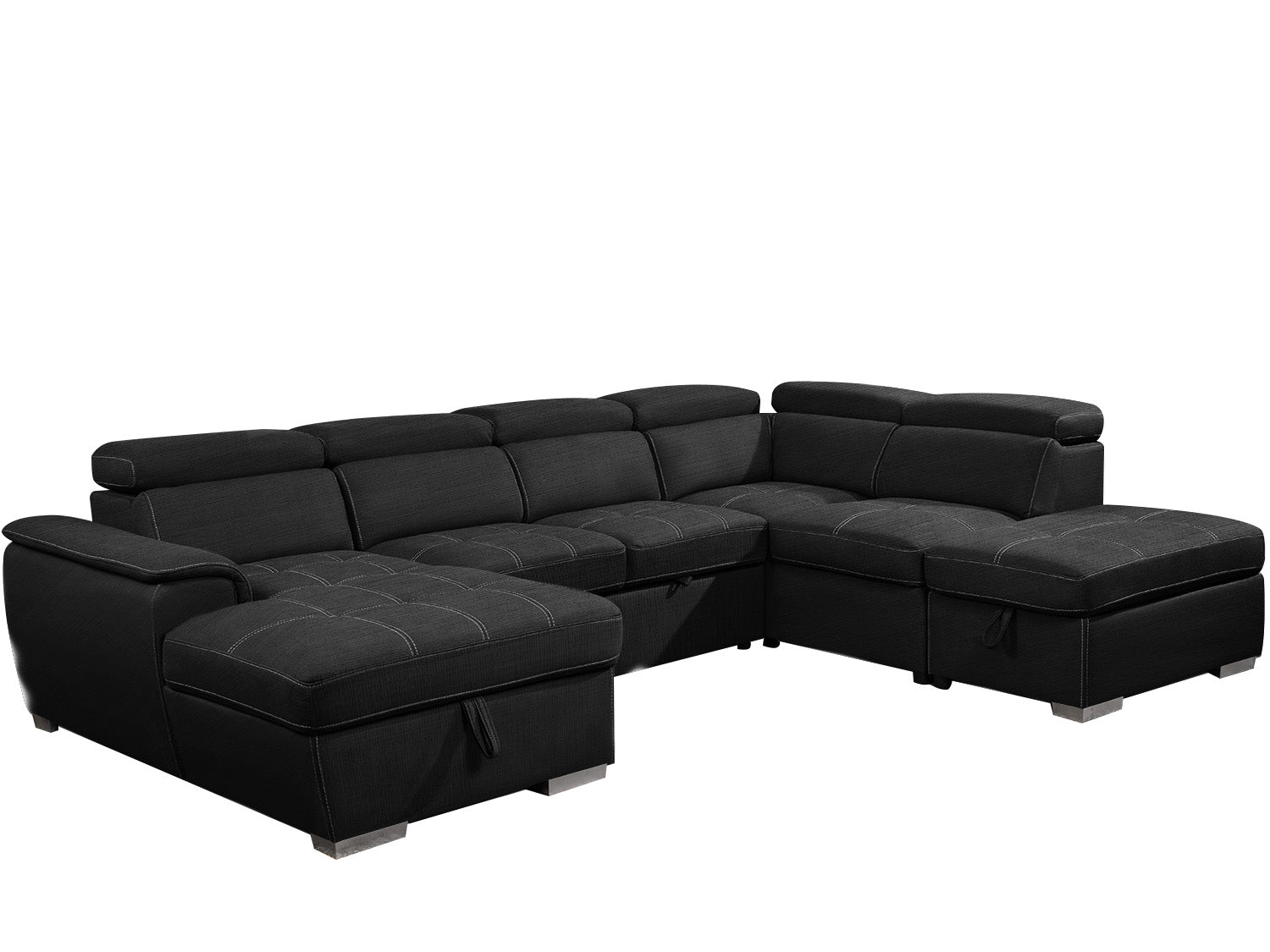 Introducing our stylish and functional lounge, perfect for any modern living space. Our lounge features a comfortable sofa bed, allowing you to easily accommodate overnight guests without sacrificing style or comfort. Our lounge also includes an ottoman with storage, providing a convenient spot to store extra blankets, pillows, or other items. The adjustable headrests add another layer of comfort, allowing you to customize the angle of your head and neck for optimal relaxation. Crafted with high-quality Cotton and linen material, our lounge is both durable and stylish. Our lounge also features a chaise on one side with storage, providing additional seating and storage space. The chaise can be used for lounging or as an extra sleeping area for guests.