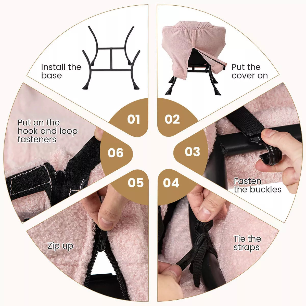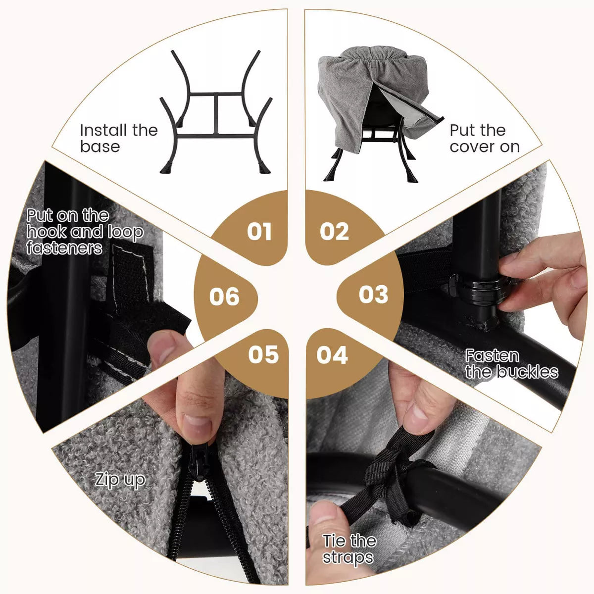 This accent chair features heavy-duty metal tubes for the base, providing a load capacity of 330 lbs for the sofa chair and 110 lbs for the footrest. The sofa comes with soft headrest and armrests that feature skin-friendly faux shearling and high-resilience PP cotton, helping you to feel fully relaxed. Furthermore, the sofa chair set includes a foldable ottoman with a removable cushion, which can quickly serve as a coffee table or as an extra seat. In addition, this reading chair can be successfully installed in 6 simple steps: ① Install the base ② Put the cover on ③ Fasten the buckles. ④ Zip up ⑤ Put on the hook and loop fasteners ⑥ Tie the straps. Whether indoors or outdoors, this large accent chair will fit perfectly into your home and offer you a relaxing corner.
