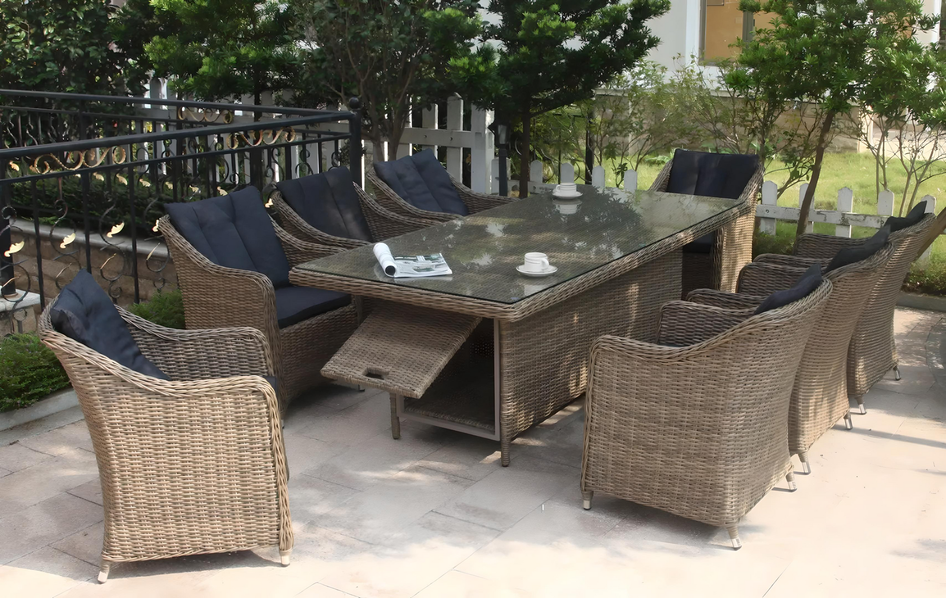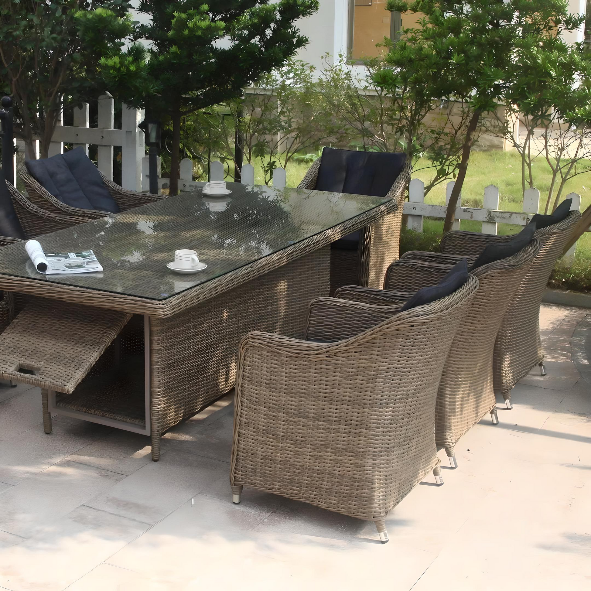 Add timeless charm and lasting comfort to your outdoor space with this 10-piece handcrafted patio dining set. Each chair is thoughtfully designed with elegant decorative armrests, high-density cushions, and durable poly rattan weaving—perfect for both residential and commercial outdoor settings.