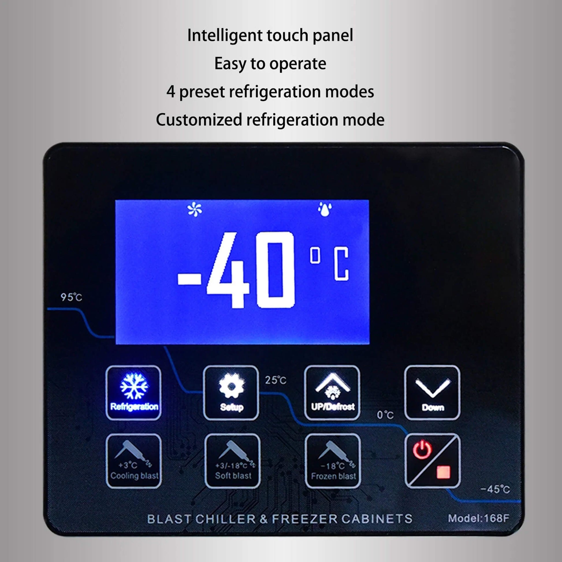 - The control panel supports multiple languages, including English and Chinese, while the durable and ergonomic large doorknob adds usability; it's ideal for preserving seafood, meat, beef, cakes, and ice cream hardening, effectively prolonging food storage periods.