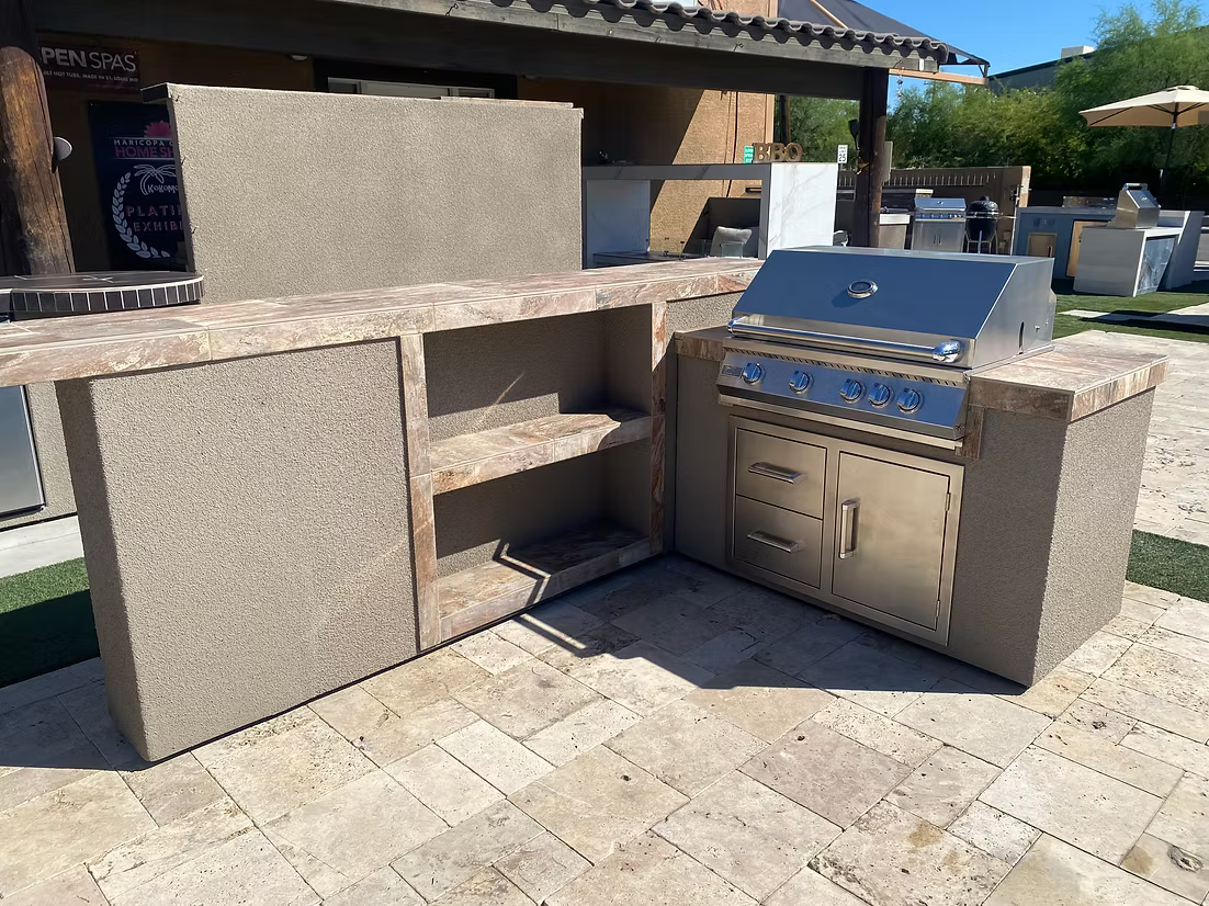 This island includes a classic 4-burner KoKoMo grill, tiled cubbies for convenient storage, and easy access to propane with dedicated storage drawers. Built to enhance your outdoor cooking experience, the Custom Aspen BBQ Island is a versatile and attractive addition to any outdoor living area.