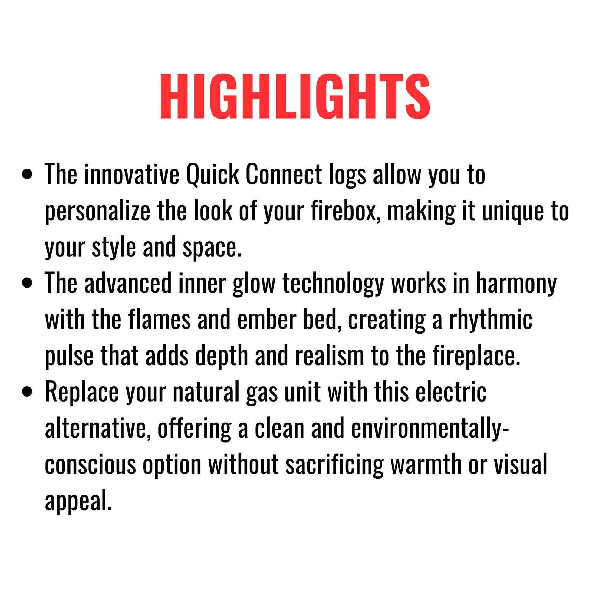 The Quick Connect moveable logs let you personalize the look of your firebox to match your unique taste.