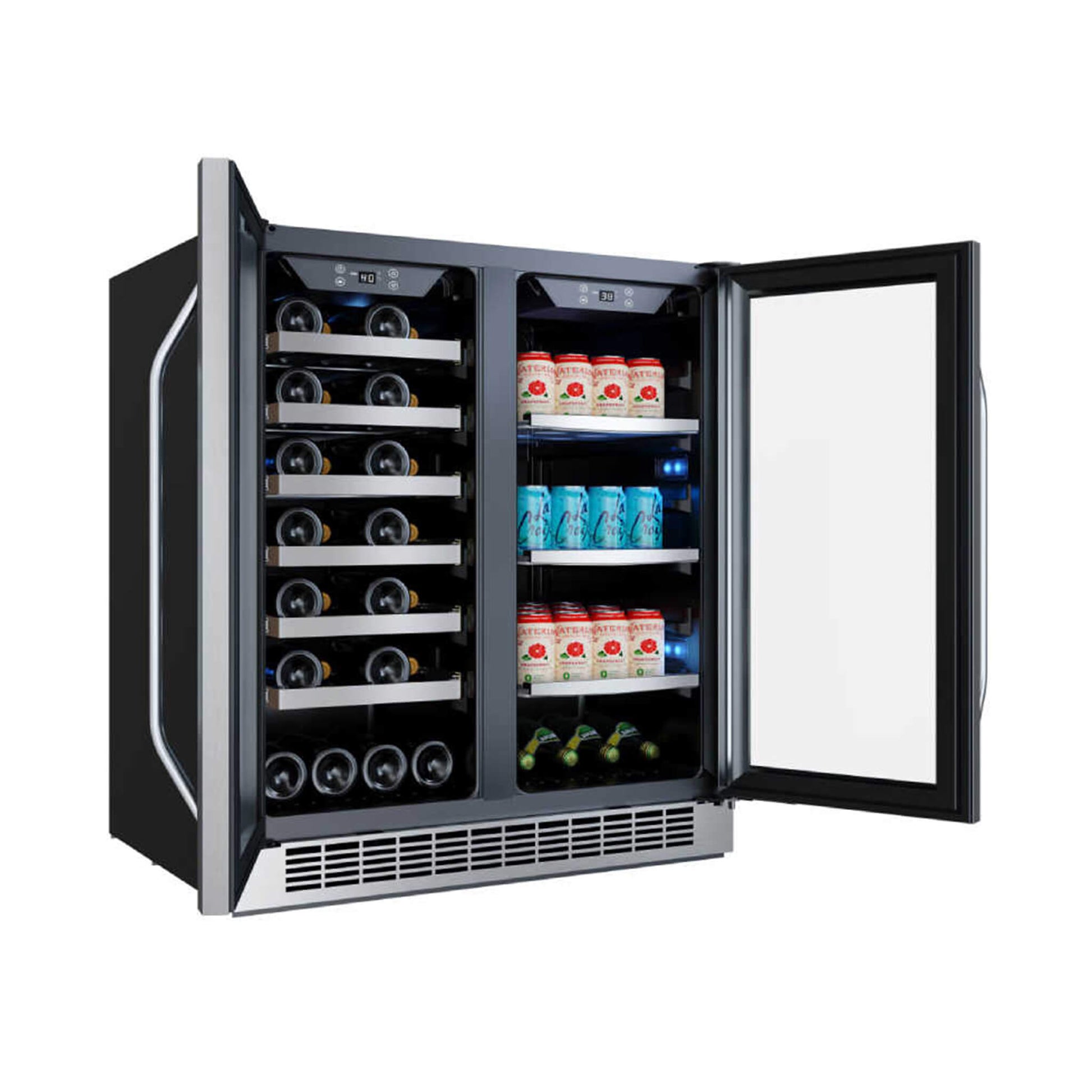 - The left side cools wine bottles from 40-65°F, while the right side chills cans from 38-65°F. Enjoy every beverage at its ideal temperature.