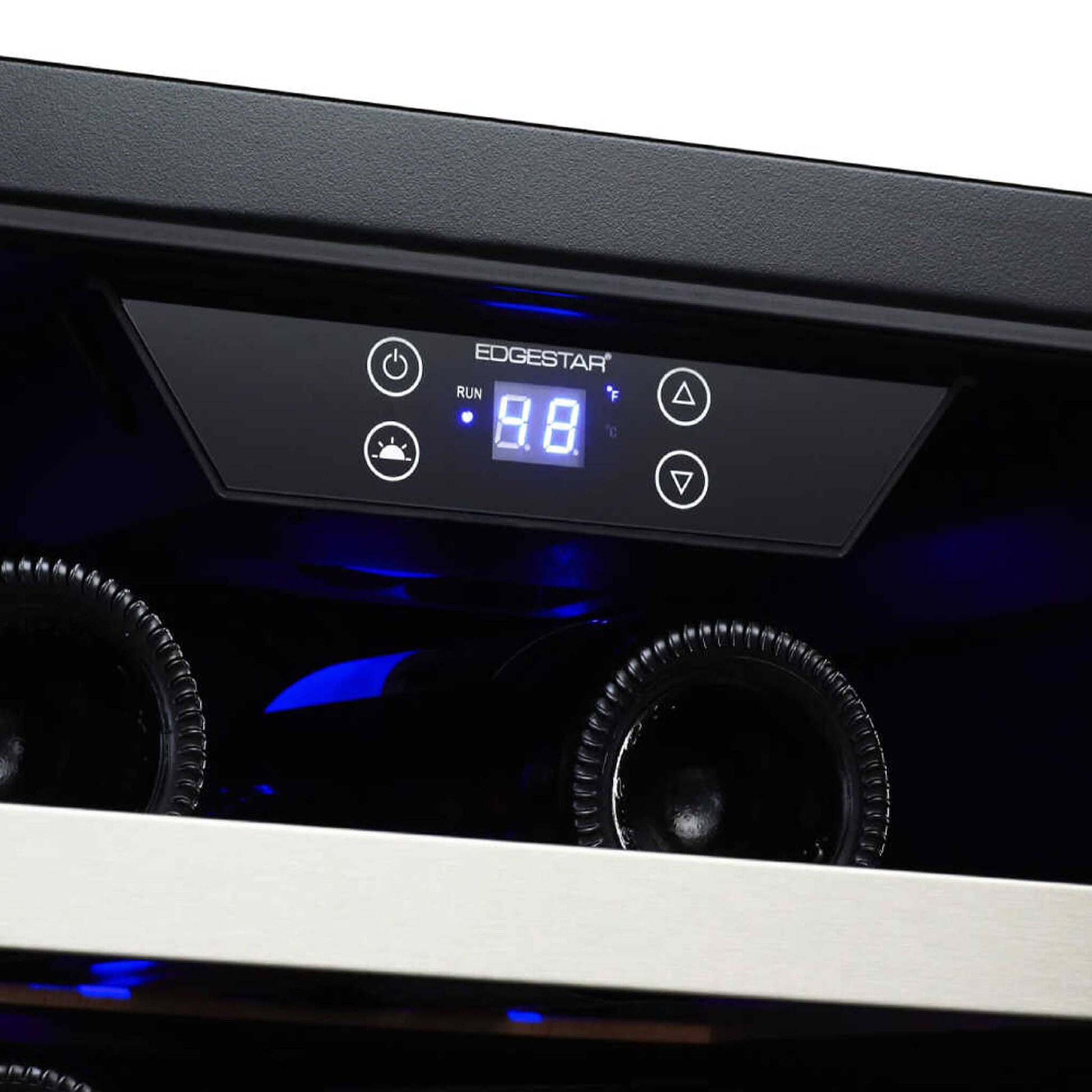 Crisp blue LED lights illuminate the interior, adding a touch of luxury and sophistication. The full pull-out wood shelves with stainless steel trim not only look great but also keep your bottles secure and easily accessible.