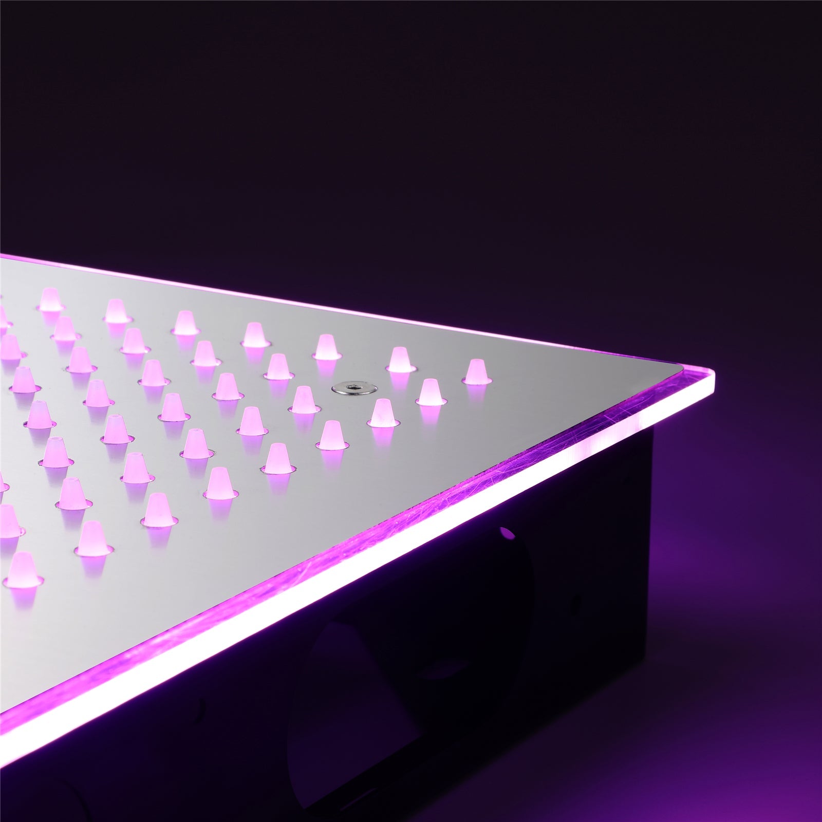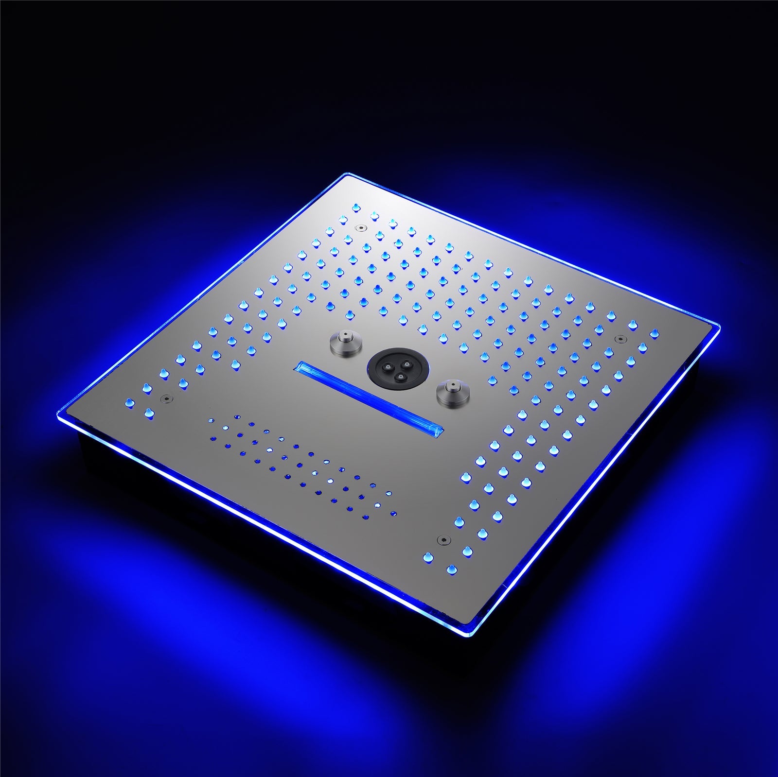 Upgrade your shower routine with our brushed nickel flushed mounted 16'' x 16'' shower head. With its stunning LED lights, versatile shower modes, high-quality construction, remote panel control, and integrated Bluetooth speaker, this shower head offers a luxurious and immersive bathing experience.