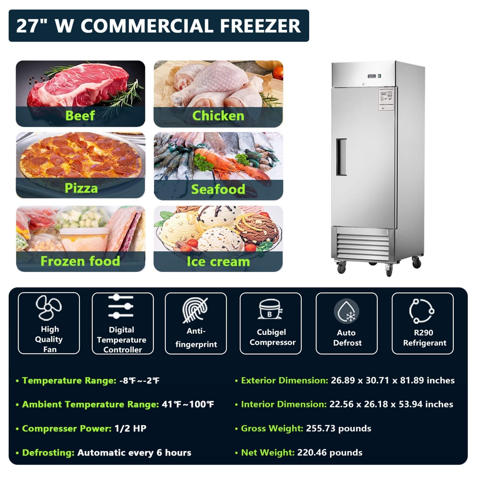 Keep your ingredients perfectly preserved with the 27-inch Commercial Upright Freezer! Designed for the demands of any busy kitchen, this unit uses an efficient R290 refrigerant and a high-performance Cubigel compressor to deliver rapid, consistent cooling. The intelligent Carel controller and fan cooling system maintain a steady temperature between -8℉ and -2℉, locking in flavor and nutrients so your food always tastes its best. Plus, its automatic defrost function and bright LED lighting make maintenance and visibility a breeze!