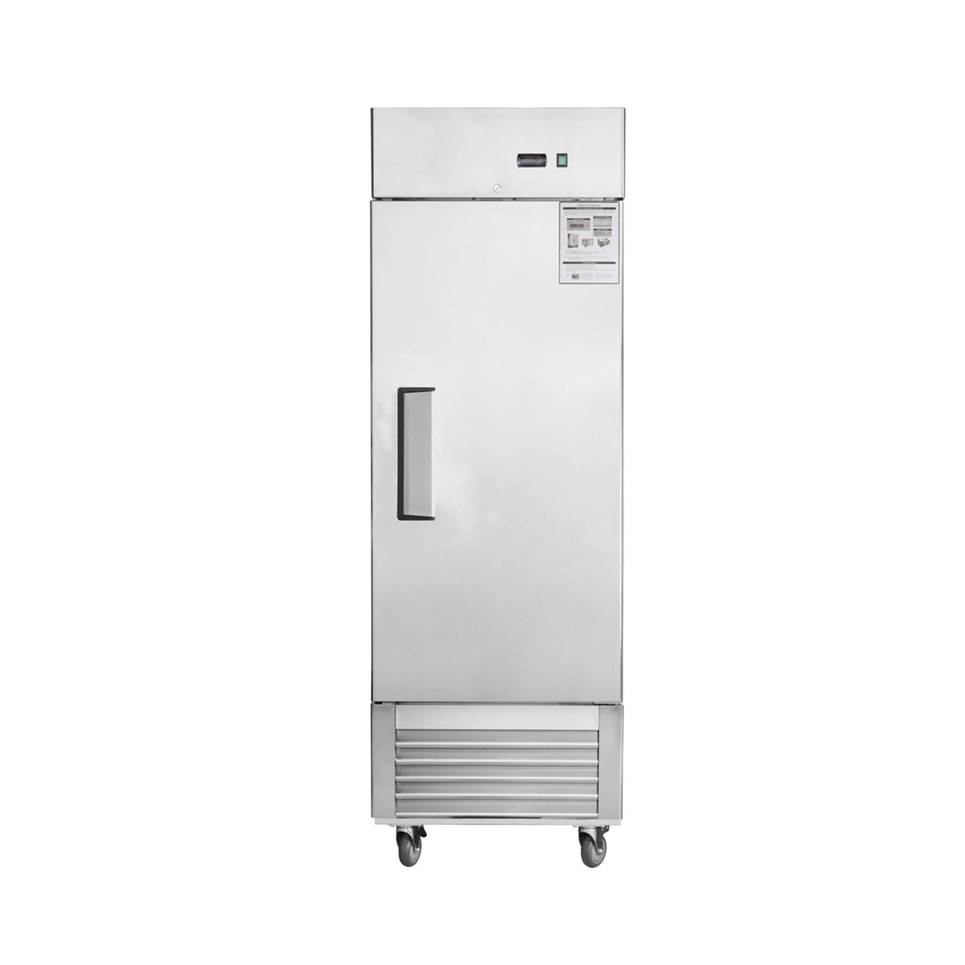 Built with heavy-duty, food-grade stainless steel inside and out, this reach-in freezer is tough enough for any commercial environment. The fingerprint-resistant finish keeps it looking sharp, while the clever door design closes automatically when opened less than 90 degrees and stays open when you need it to. With three adjustable shelves that can each hold up to 66 lbs and four heavy-duty casters for easy mobility, organizing your stock has never been simpler.
