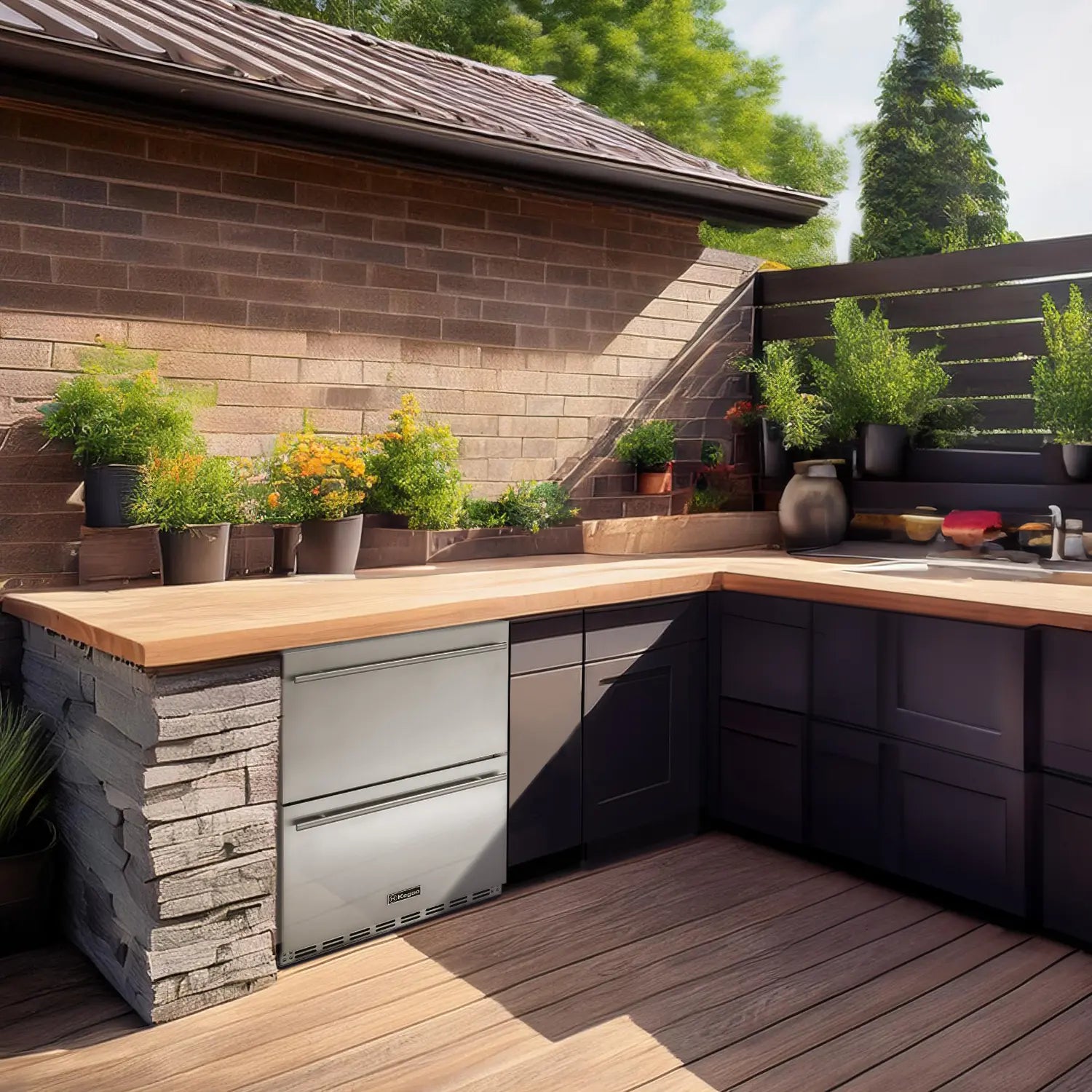 Inside, a 4-way adjustable divider helps keep your drinks organized and easy to access. Removable drawers glide smoothly on ball-bearing slides, making it simple to clean the interior thoroughly when needed. Measuring 34.1" H x 23.6" W x 23.6" D, this beverage center offers a smart combination of durability, capacity, and modern design.