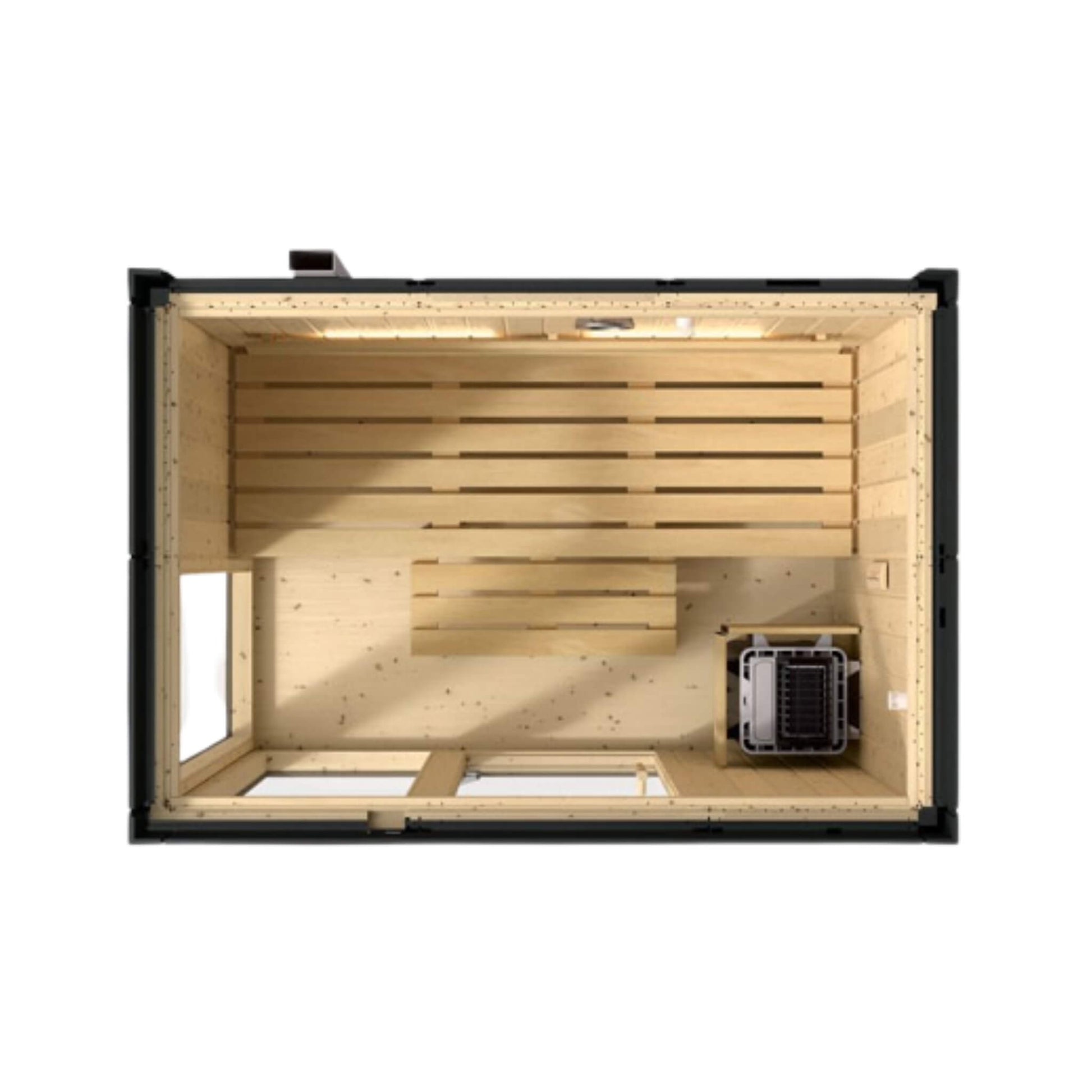 - The cabin is expertly crafted with tongue-and-groove connections for a seamless appearance, featuring a premium Scandinavian spruce interior, a modern Graphite Gray exterior, and 0.3-inch tempered glass doors with beech wood handles that remain safe and cool to the touch.