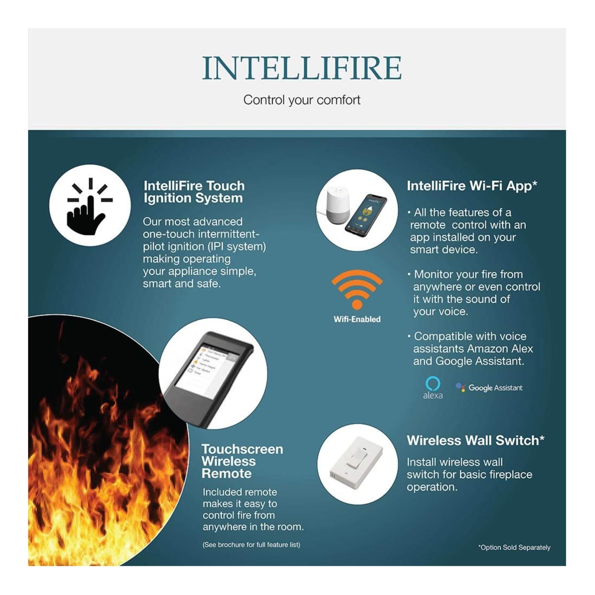 Enjoy uninterrupted comfort with the IntelliFire Touch technology, offering convenient control at your fingertips. Whether through the intuitive touchscreen remote or wireless wall switch, you can easily adjust your fireplace to fit your lifestyle.