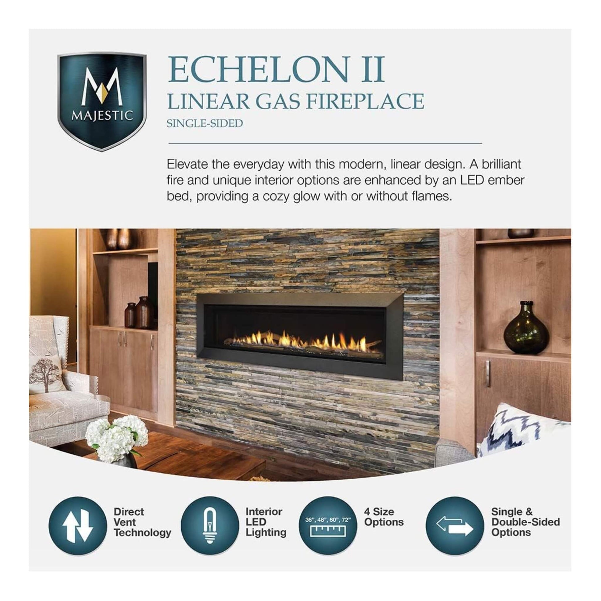 Whether you're seeking warmth, ambiance, or a gathering place for loved ones, the Echelon II delivers. Its modern design complements a variety of interior styles, making it a versatile addition to any home. So, why wait? Elevate your living experience with the Majestic Echelon II 60" Linear Direct Vent Fireplace.