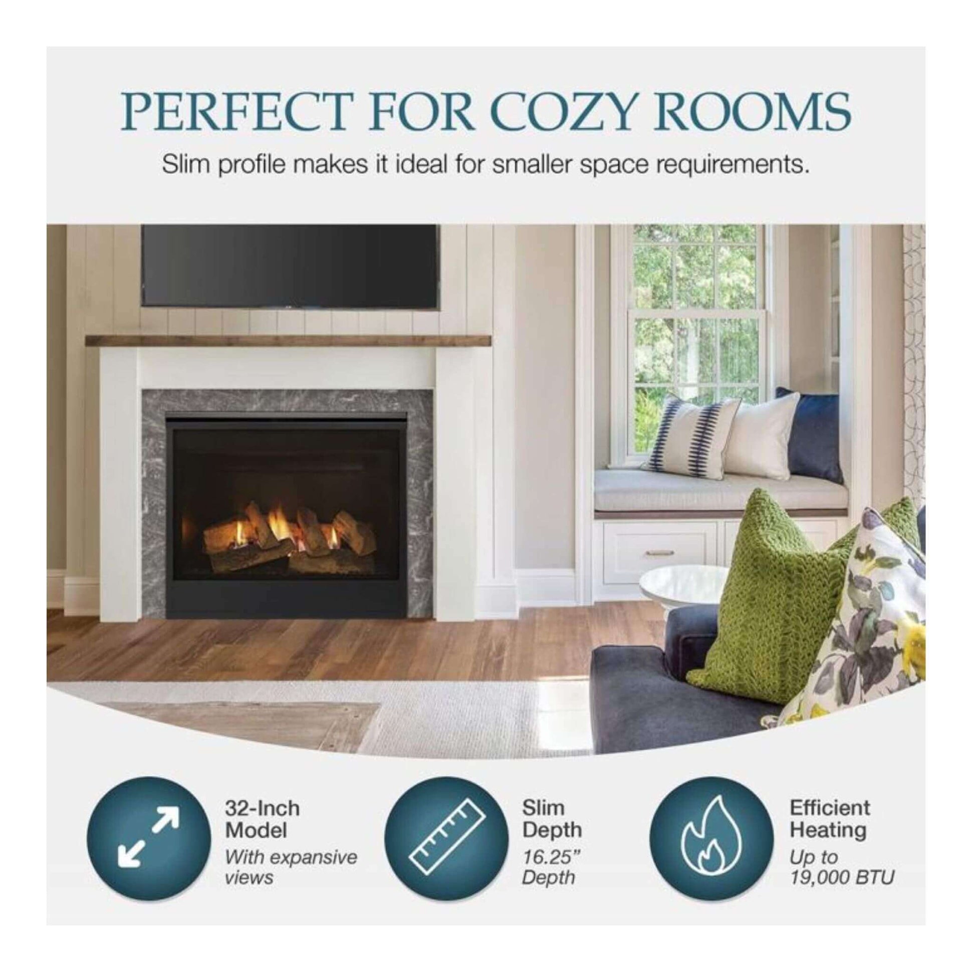 With its slim depth, this fireplace is perfect for small rooms, corners, or any tight spaces. It allows you to maximize your living area without compromising on style or comfort.