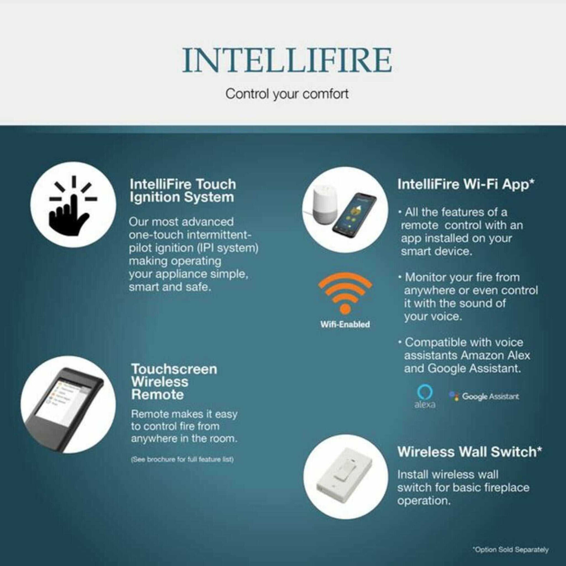 Take advantage of modern technology with the IntelliFire Touch system. Control your fireplace effortlessly using the IntelliFire App, Smart Speaker, touchscreen remote, or wireless wall switch, giving you convenience like never before.