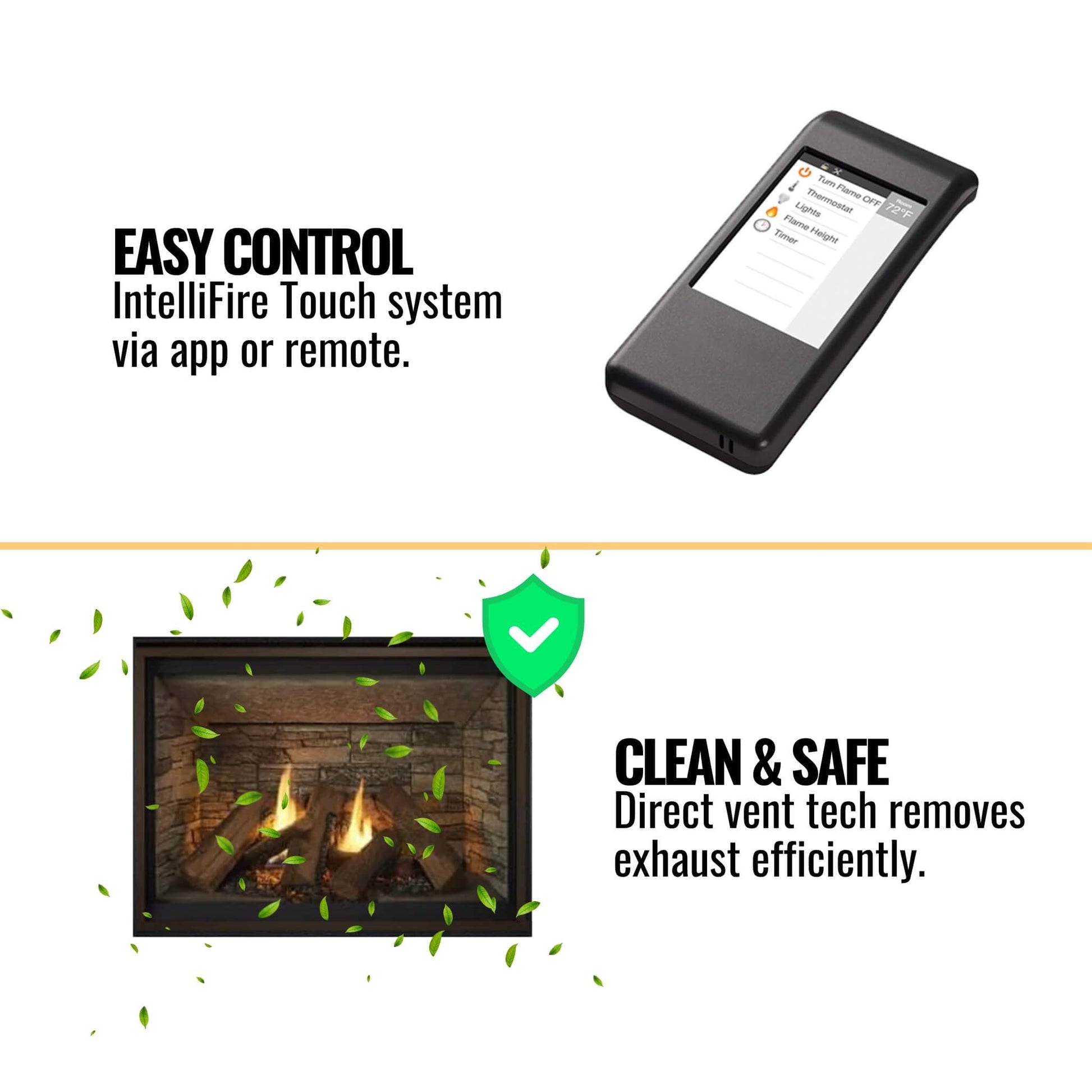 With the IntelliFire Touch system, you can manage your fireplace seamlessly using the IntelliFire App, your smart speaker, a sleek touchscreen remote, or even a wireless wall switch. Enjoy the perfect ambiance with just a touch.