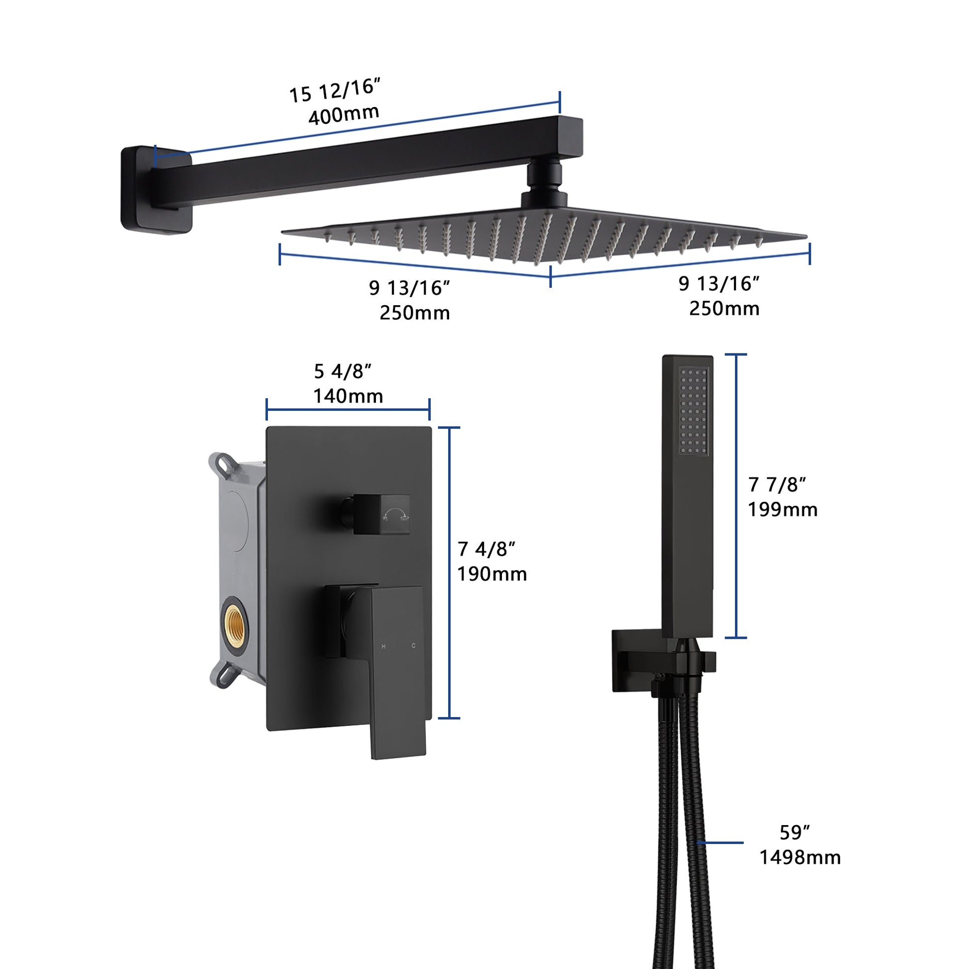 The set also includes a 16'' wall-mounted shower arm made of brass, a metal shower holder with NPT1/2'', a metal handheld shower designed to deliver high water pressure, and a 59'' stainless steel shower hose that is flexible and easy to install.