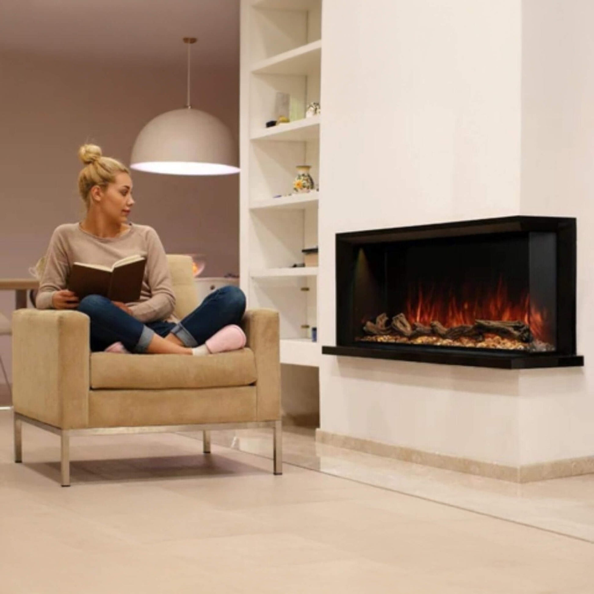 Transform your space into a stunning showcase of modern elegance with the sleek three-sided design and high-intensity RGB flames that set the perfect ambiance.