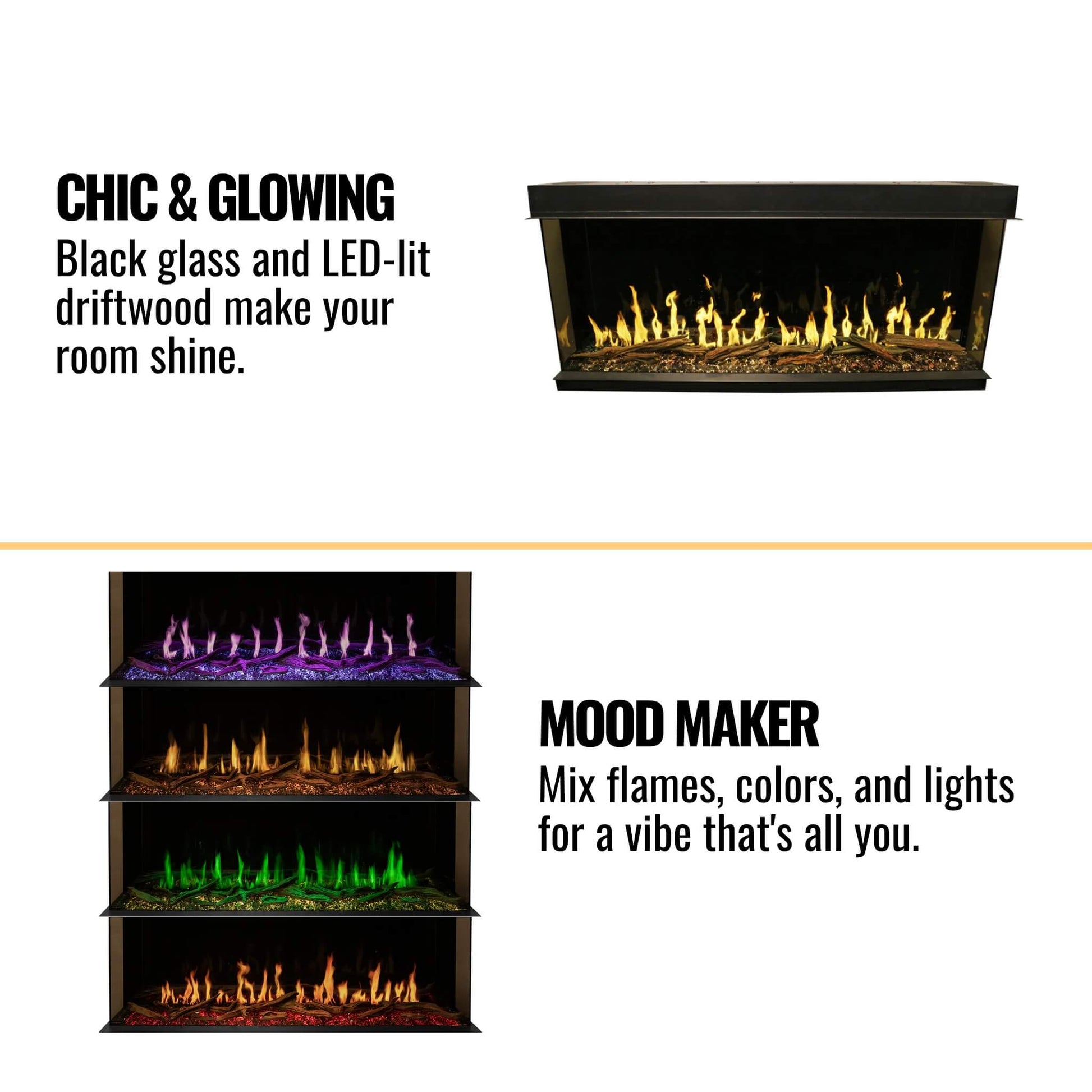 Choose from three unique flame styles Hybrid, Wood, and Gas and six stunning flame colors, including yellow, blue, green, orange, purple, and white. With 18 different flame color displays, customizable ember bed, and downlighting options, every moment by the fire becomes a captivating experience.