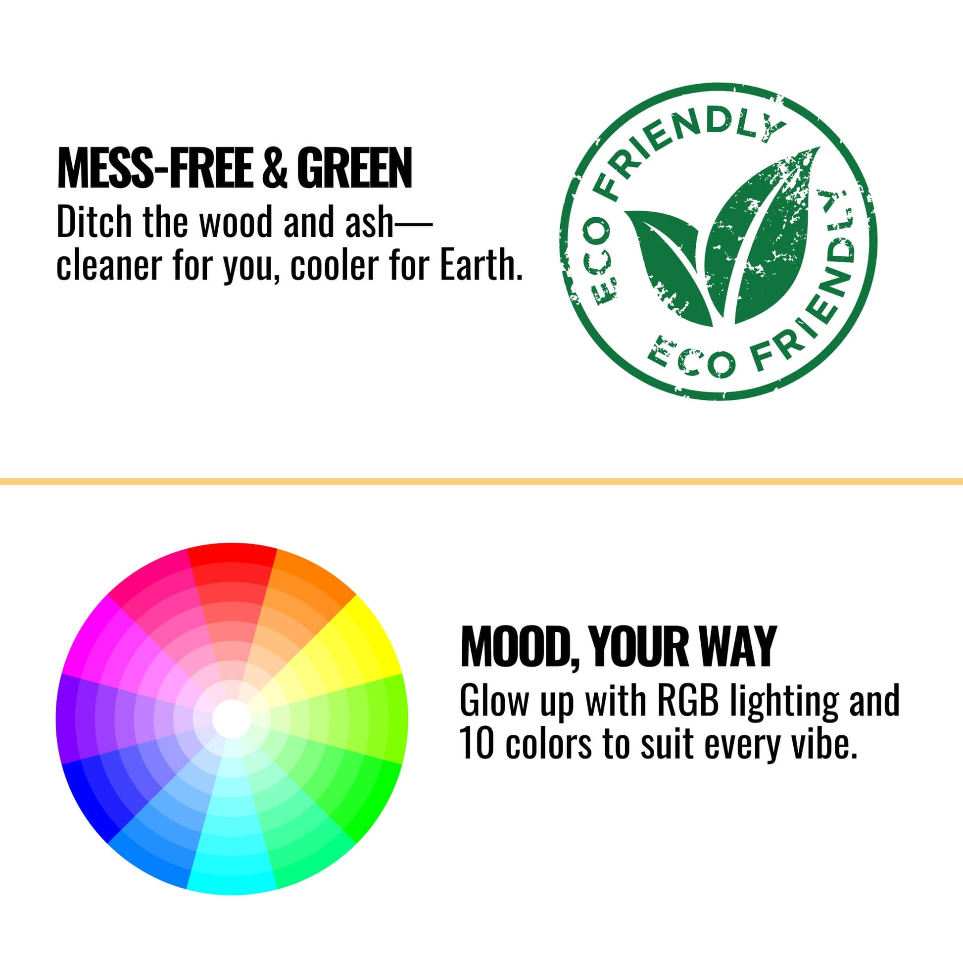 With high-intensity RGB lighting, independently controlled up lighting, down lighting, and flame colors, you can create the perfect atmosphere. Choose from 10 unique colors to match your mood or decor.