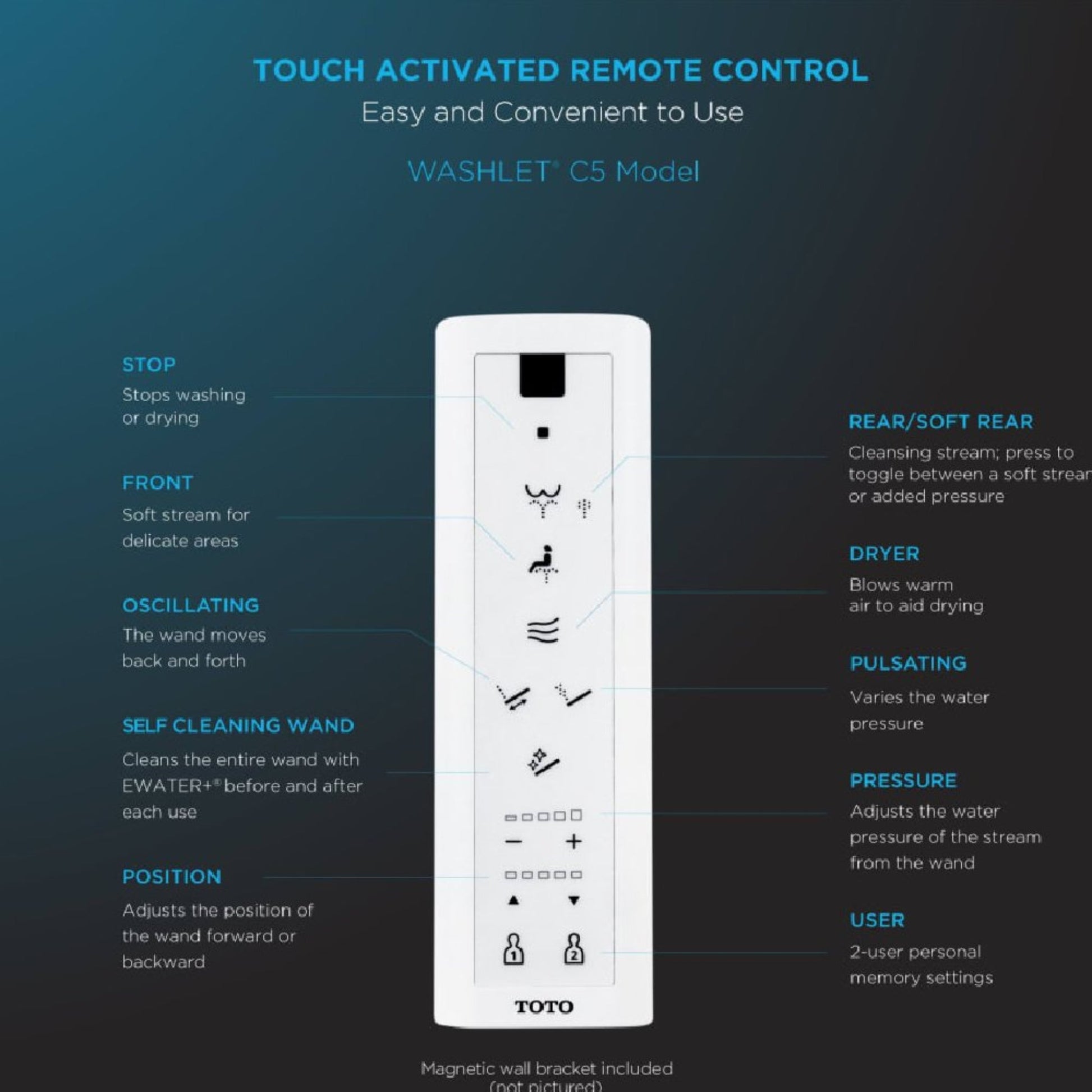- Navigate your preferences effortlessly with the slim, wireless remote. No more fussing with knobs or levers—the power is in your hands.