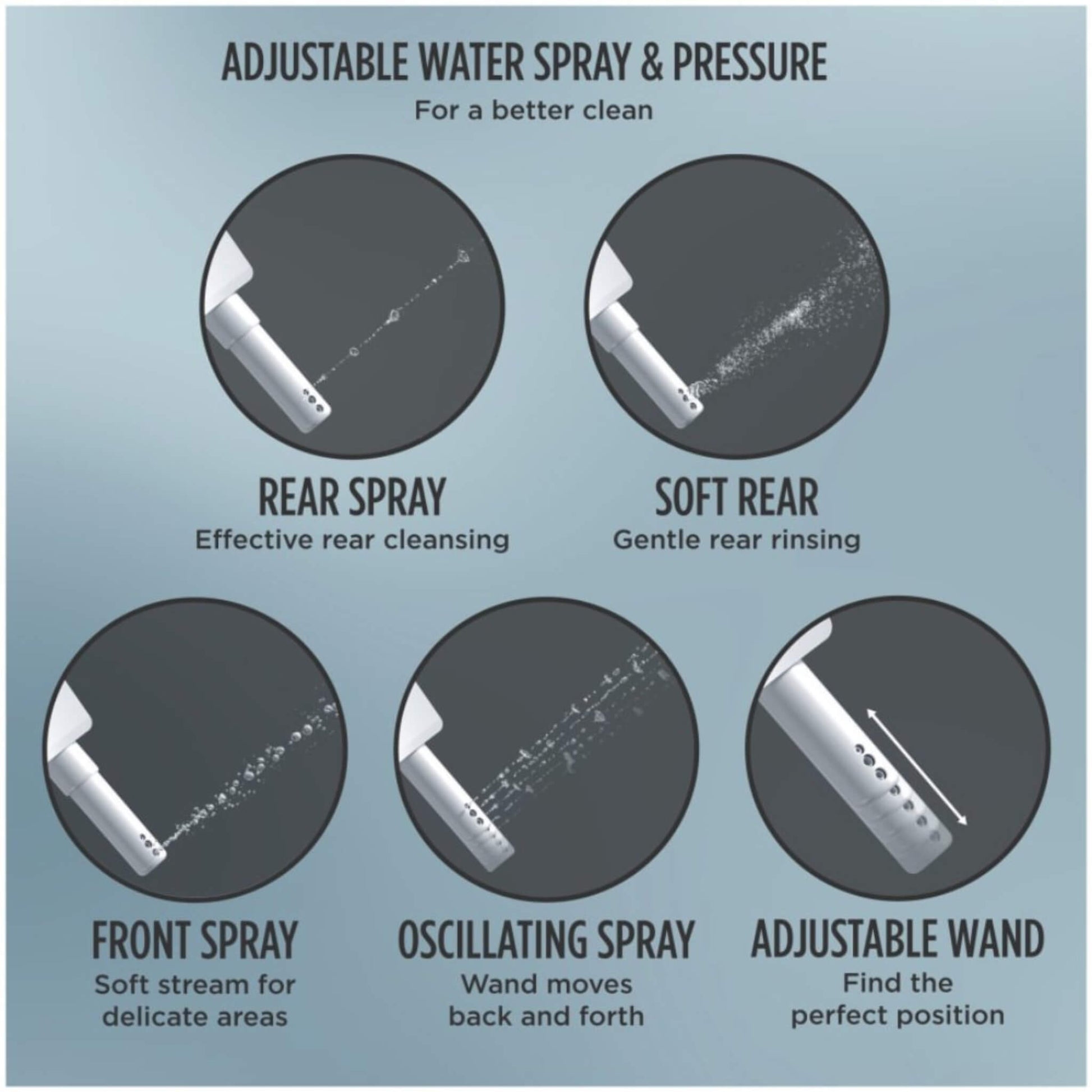 - Experience personalized cleansing with adjustable water temperature and pressure settings, along with soft rear spray, rear cleanse, and front cleanse options. The convenient arm control panel puts the power in your hands.