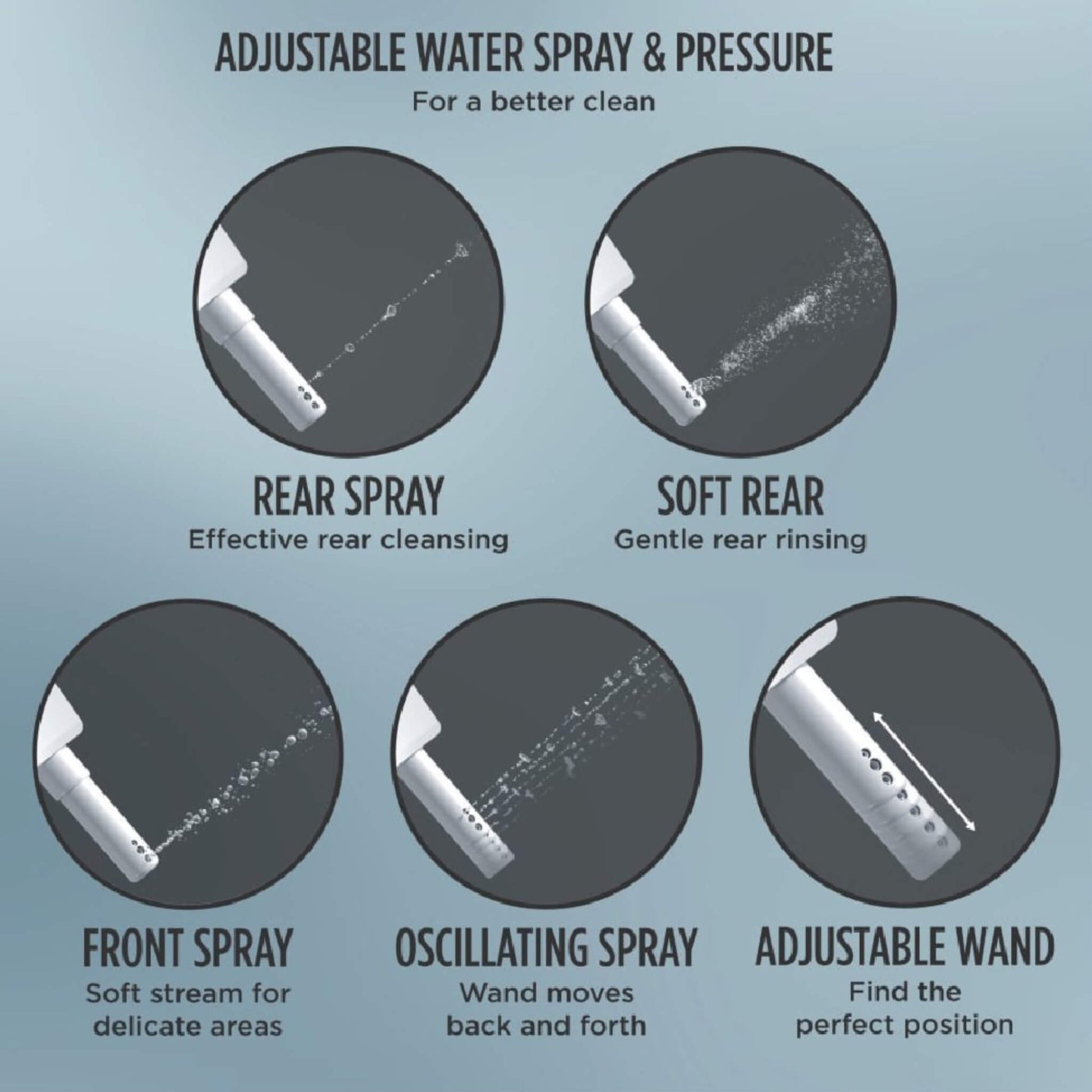 - Enjoy personalized comfort with adjustable temperature and pressure settings for the soft rear spray, rear cleanse, and front cleanse features. The oscillating or pulsating stream adds to the refreshing experience.