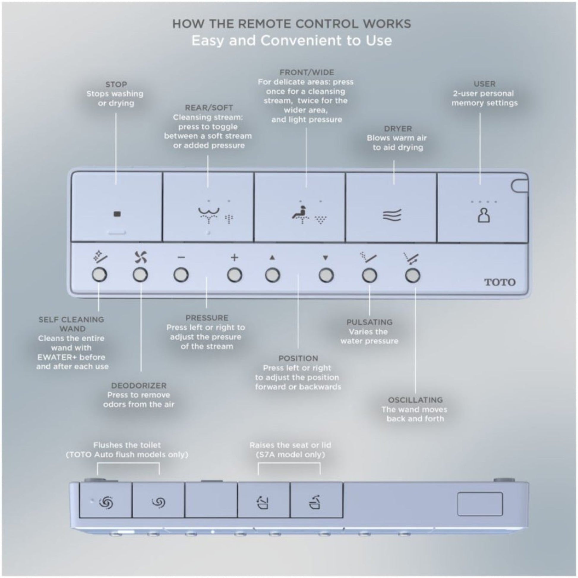 - Experience superior cleanliness with TOTO's EWATER+ system, PREMIST function, and TORNADO FLUSH design, reducing the need for harsh chemicals and enhancing hygiene.