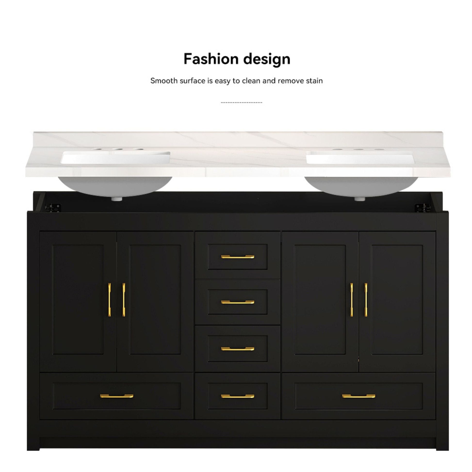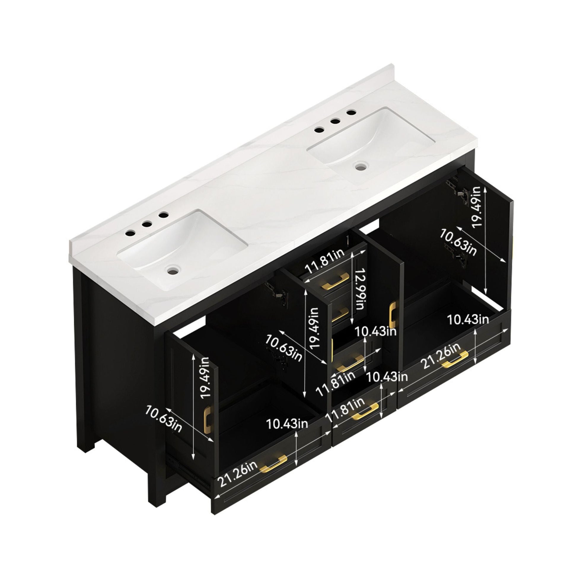 - The vanity's expansive 60-inch width offers a substantial surface area for your daily essentials and commands attention, making it a stunning focal point in any master bathroom.