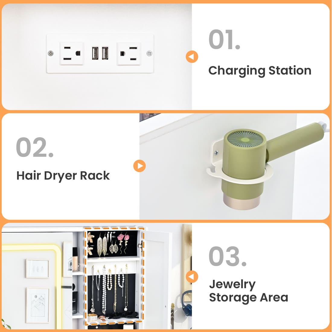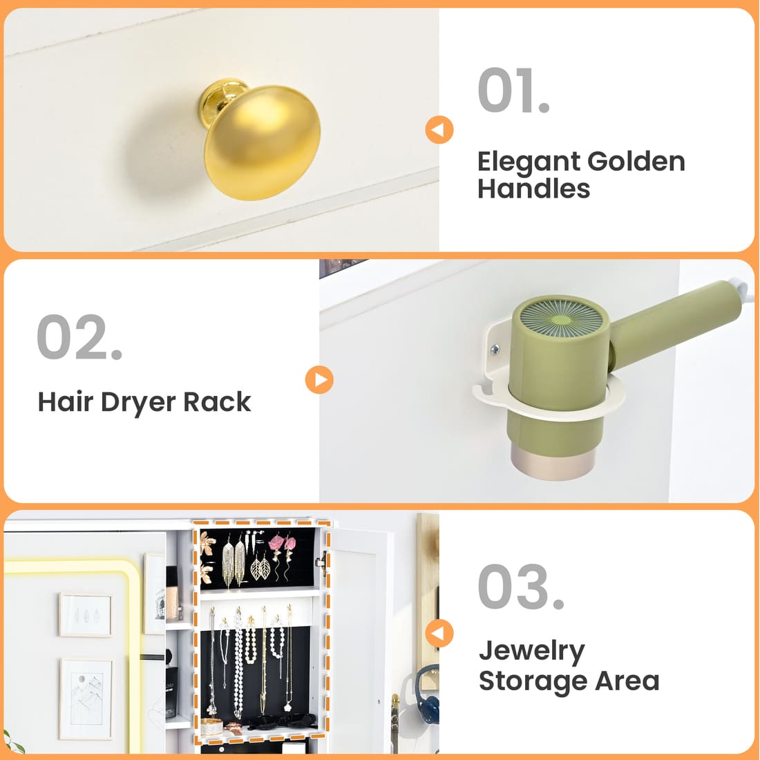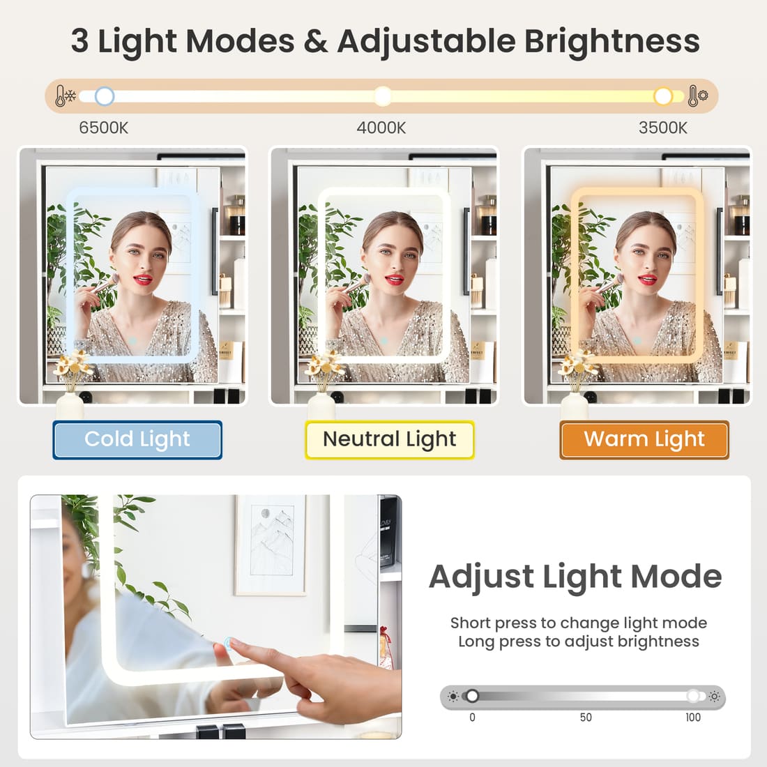 Sliding LED Mirror: With sliding tracks equipped, there is a large hidden storage space behind the sliding mirror. The lightness will be adjustable if you long press the button. You can do your makeup at a different angle or organize your cosmetics with a little push to the mirror.