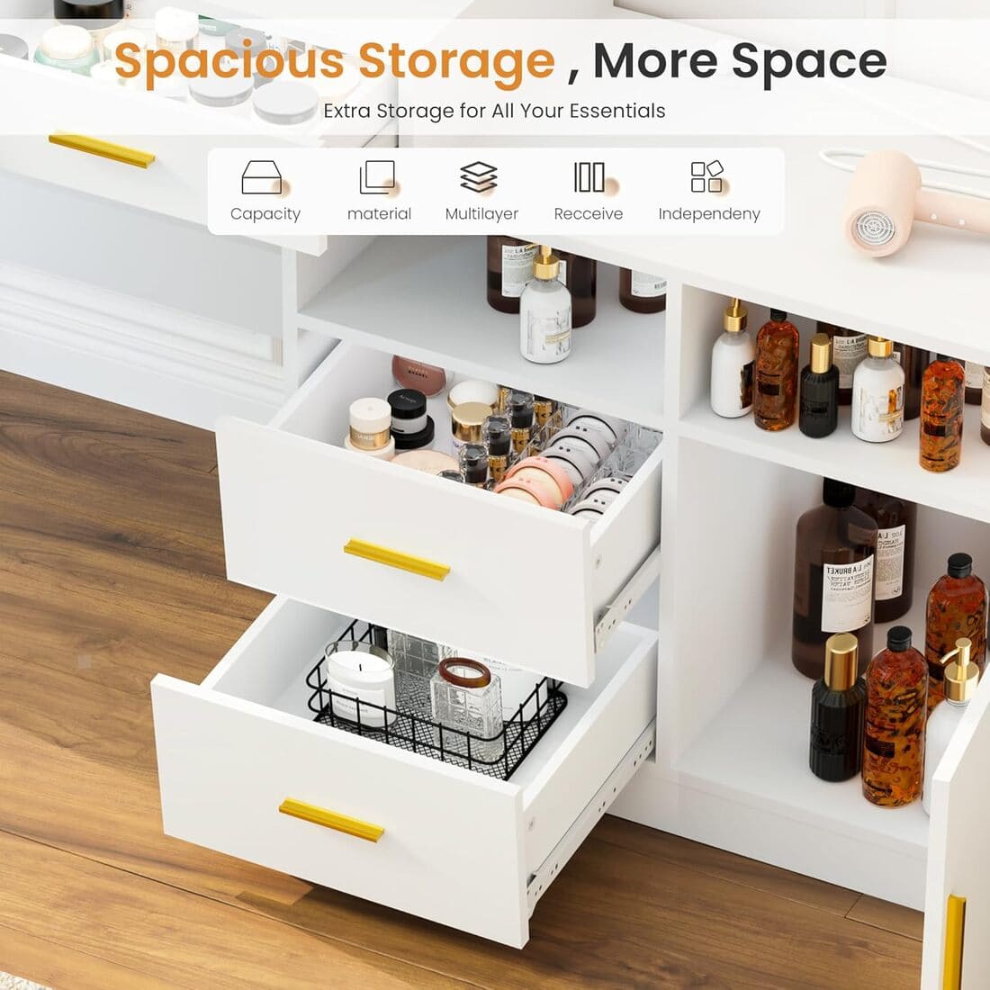 4 drawers, 8 open shelves & side cabinet provide ample Storage to organize all beauty essentials