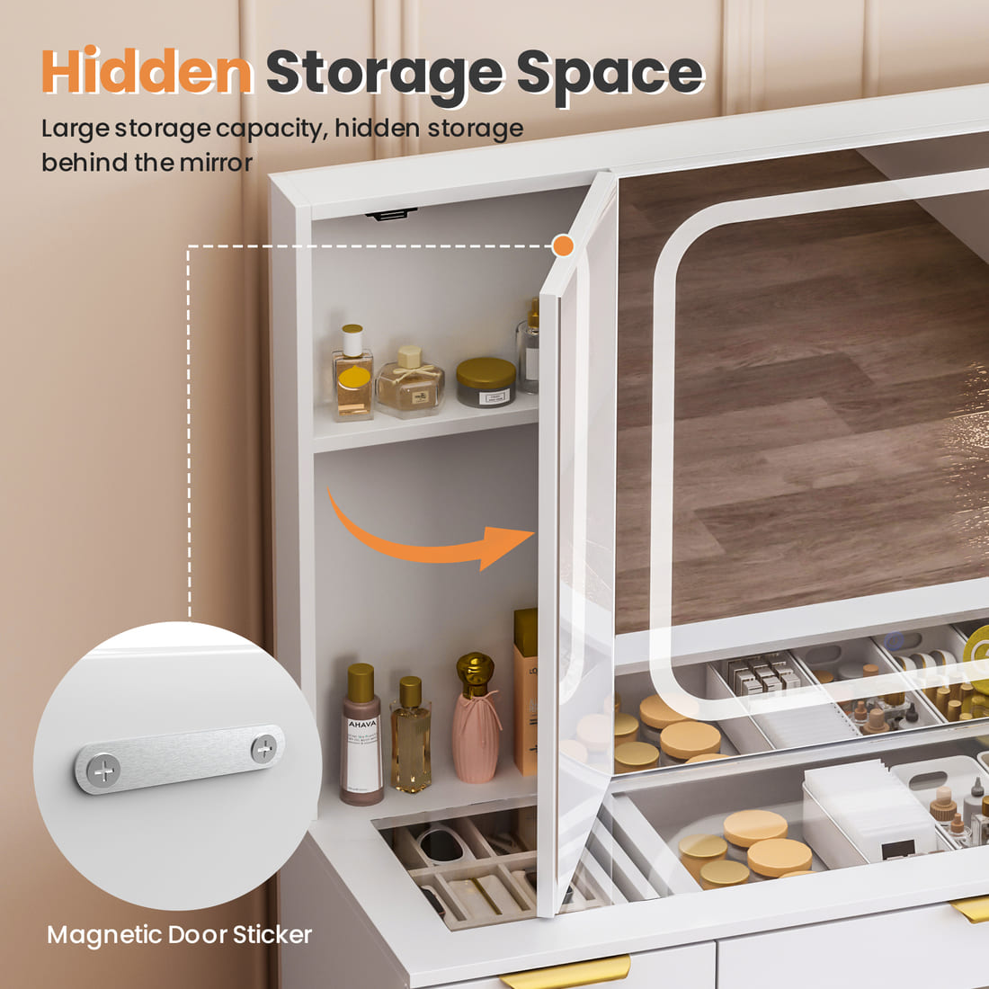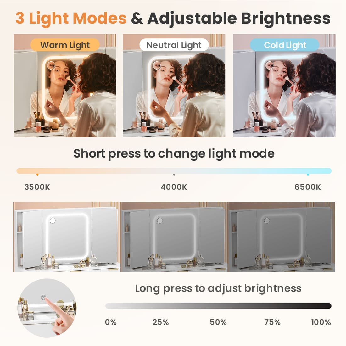 Tri-Fold Mirror with LED Lighting: The vanity desk features a large tri-fold mirror with adjustable LED bulbs, offering three color settings (white, neutral, warm) and brightness adjustable for optimal lighting during your makeup routine