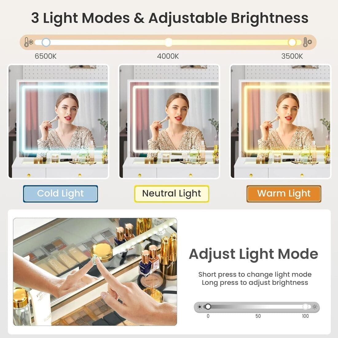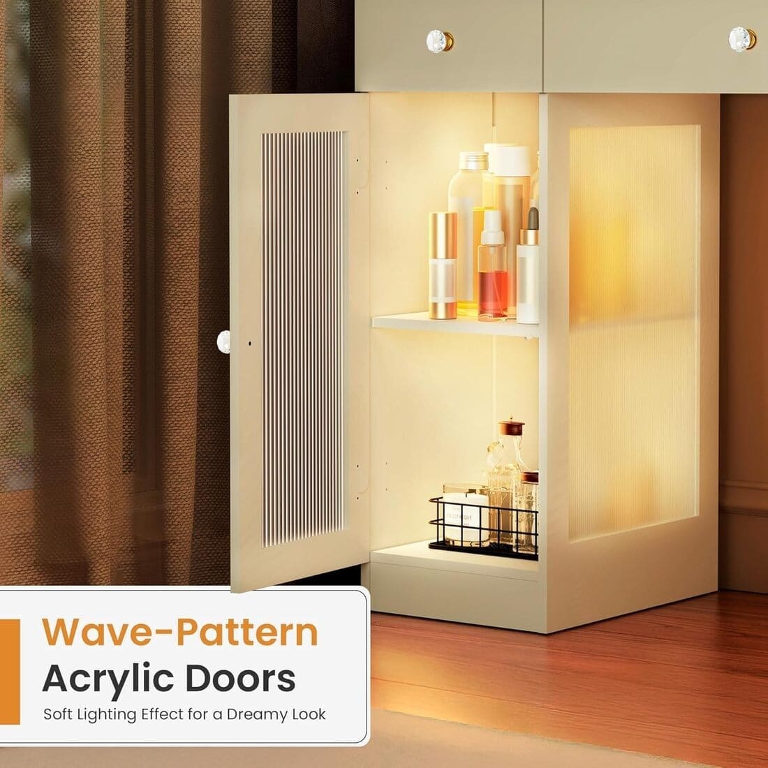 Pamapic Tempered Glass Top Vanity Desk with Lighted Mirror, 2 Transparent Cabinets & 3 Drawers