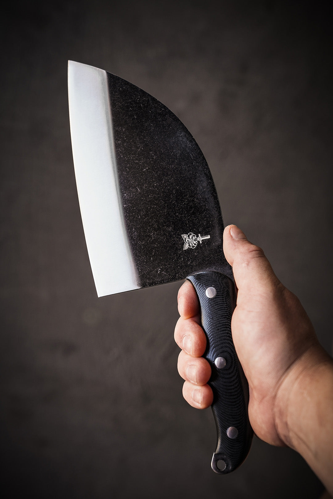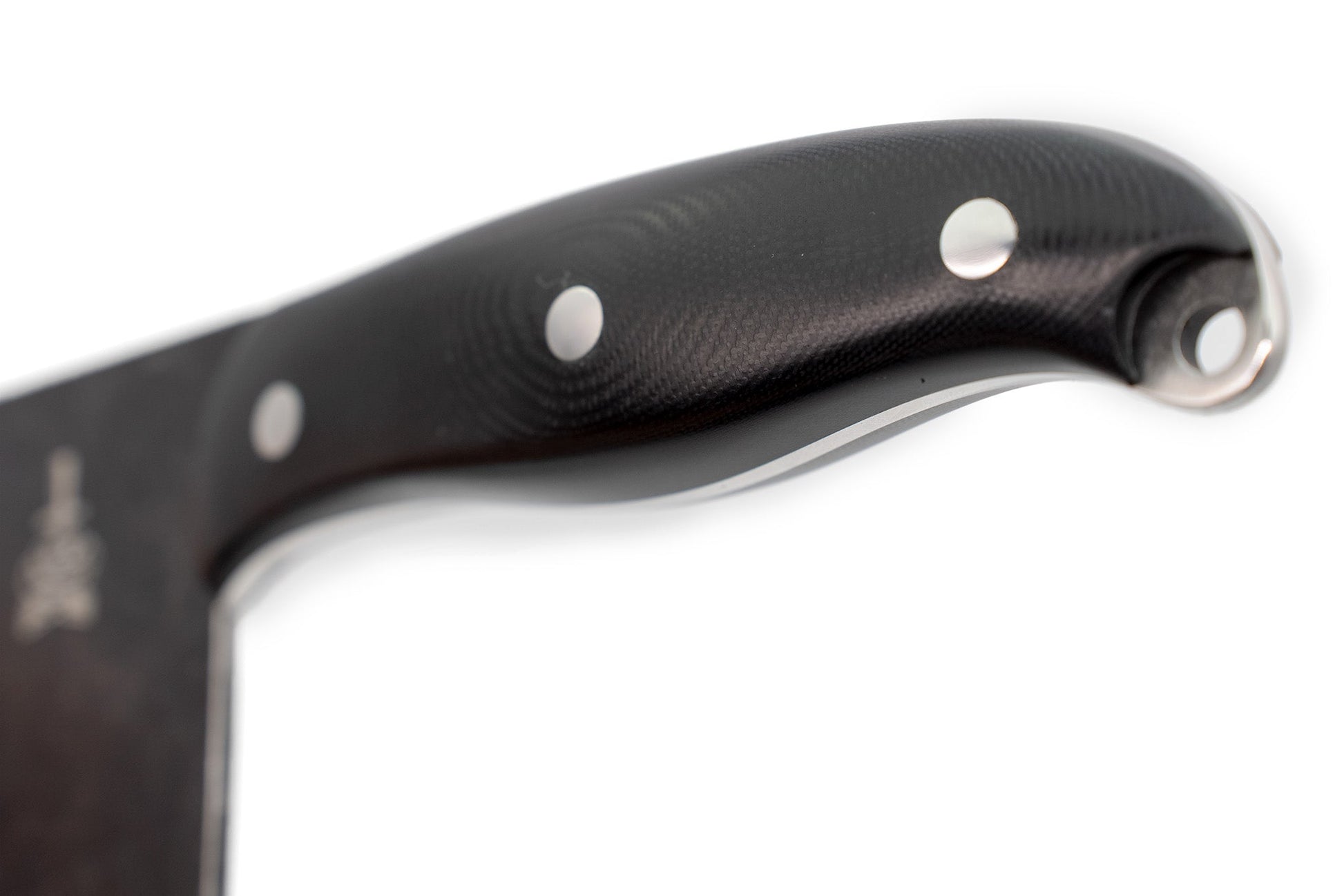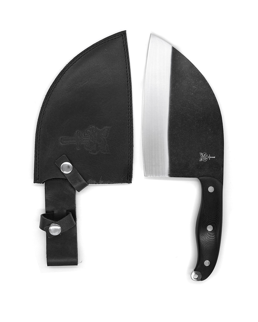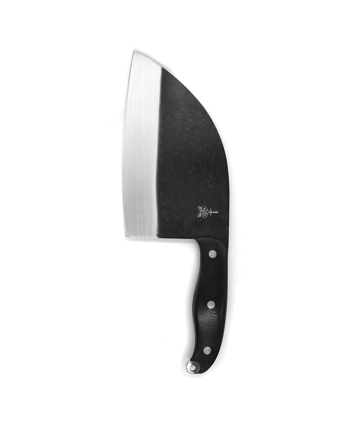 It's time to bring your kitchen outdoors because this knife was made to go camping with you. This rugged chef knife is made with 1095 High-Carbon Steel and outfitted with a beautifully contoured G10 handle to tackle everything the outdoors can throw at it. The handle features a slim tapered neck for a super comfortable pinch grip with a nice fat body to fill out the palm of your hand. Pack a bag and bring the steak, because your next campfire meal is about to be LIT. Includes a custom-fit leather sheath with a loop for attaching it to your belt or carry pack.