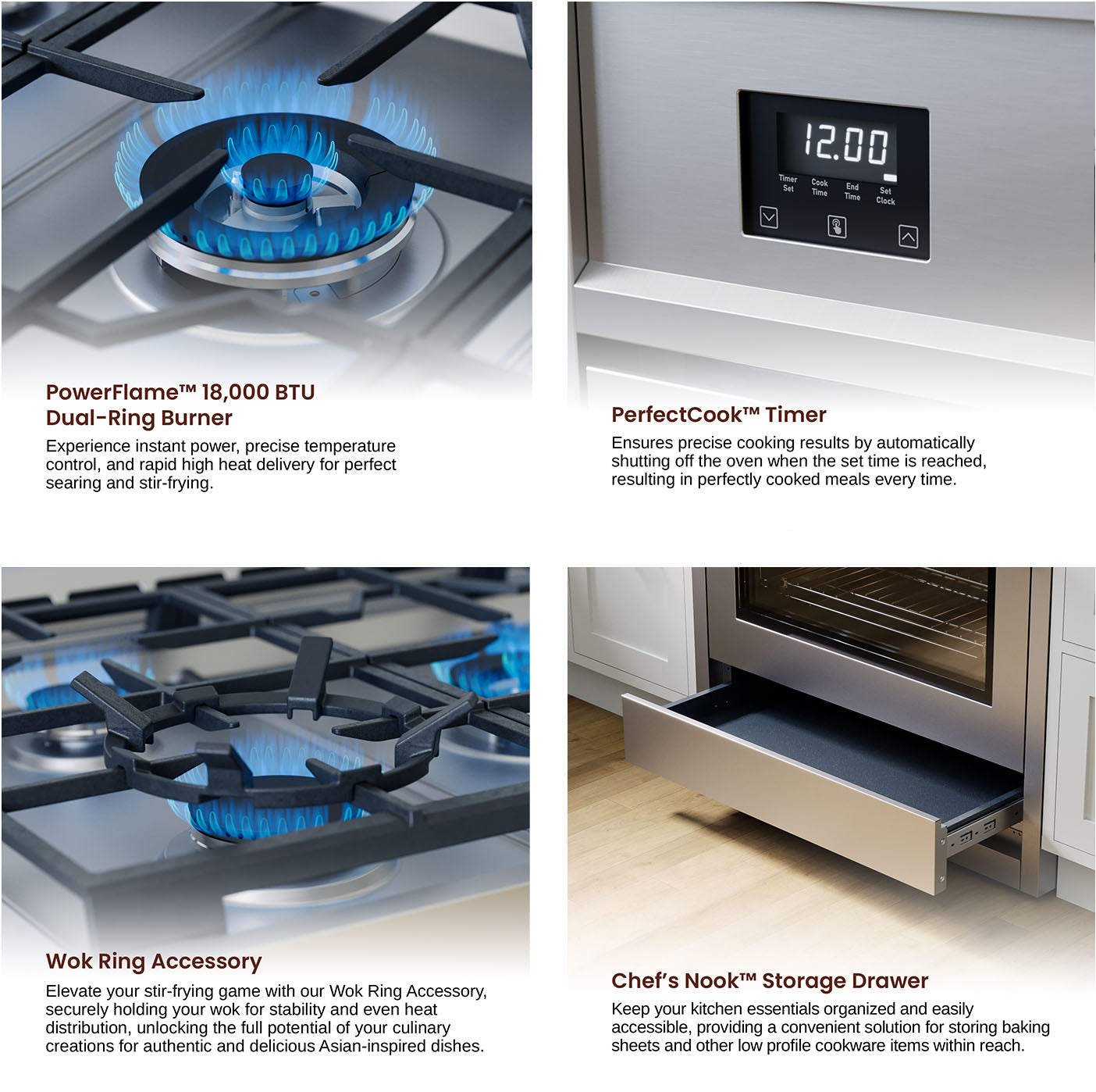 PowerFlame™ Dual-Ring Burner – Experience instant power, precise temperature control, and rapid high heat delivery for perfect searing and stir-frying.
