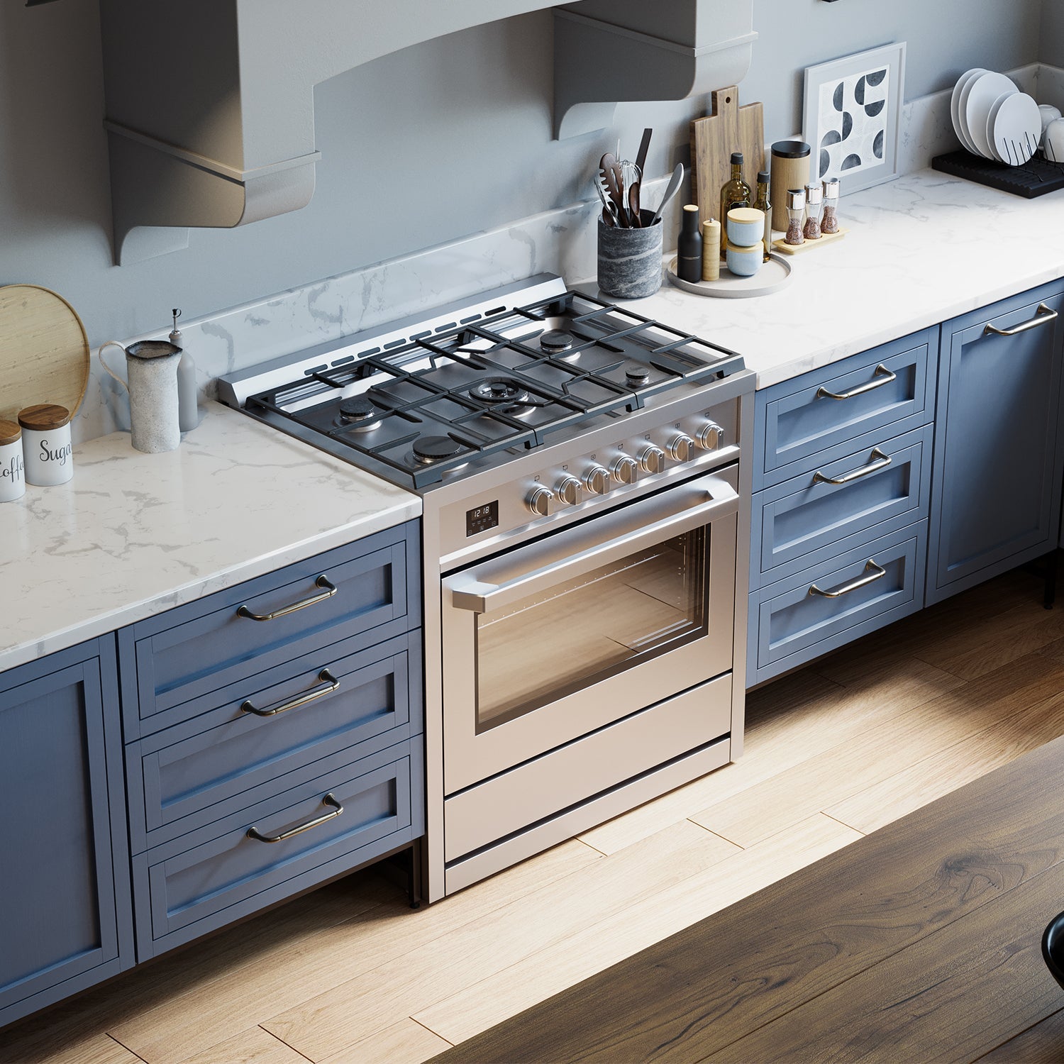 36" Range: Spacious and powerful, ideal for larger families and kitchens, offering ample room and performance for multi-course meals and entertaining.