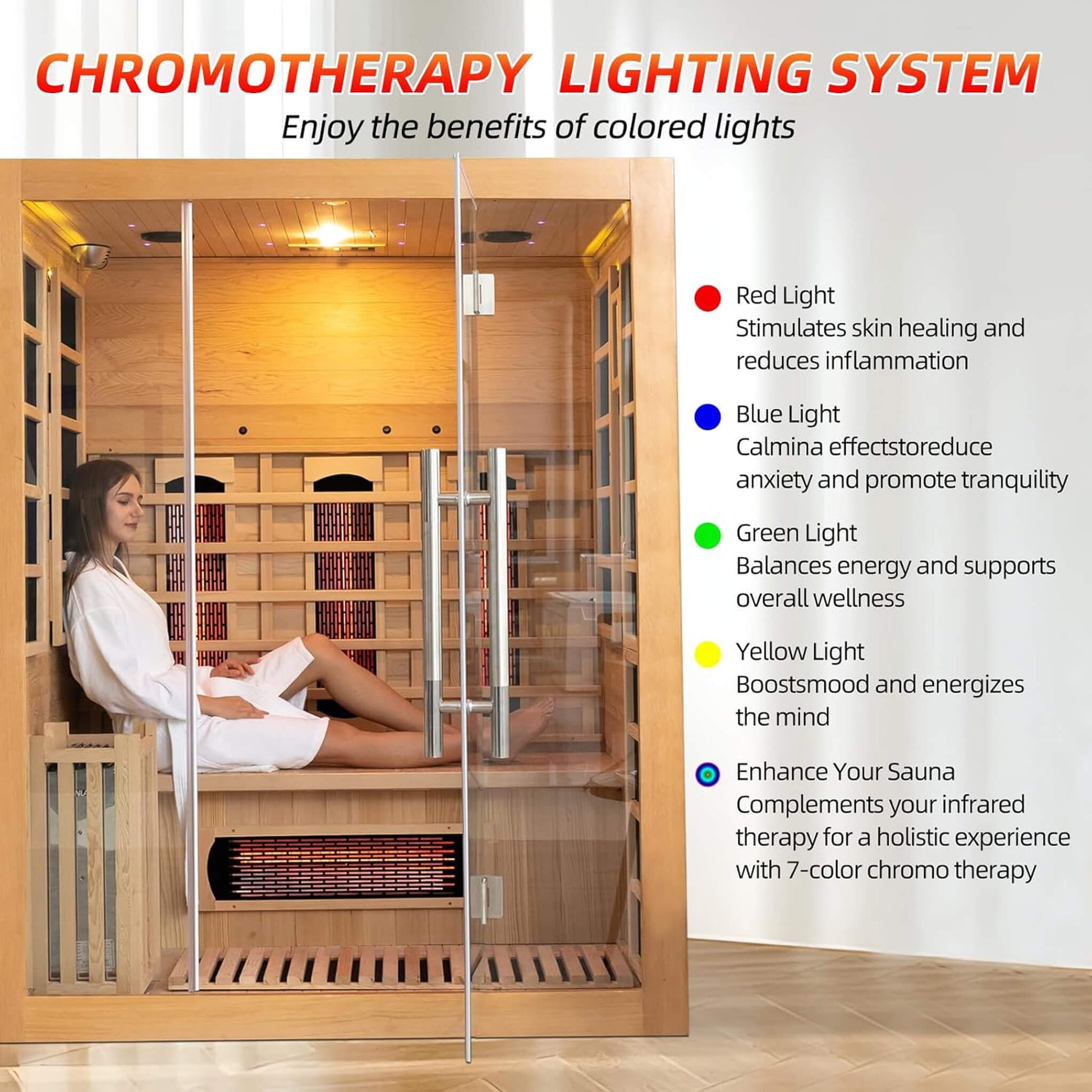 - This advanced sauna is designed to enhance your relaxation experience with its innovative features, including seven therapeutic-color lights, an oxygen bar for improved air quality, and adjustable top vents that allow you to control both humidity and airflow for a fully customized session.