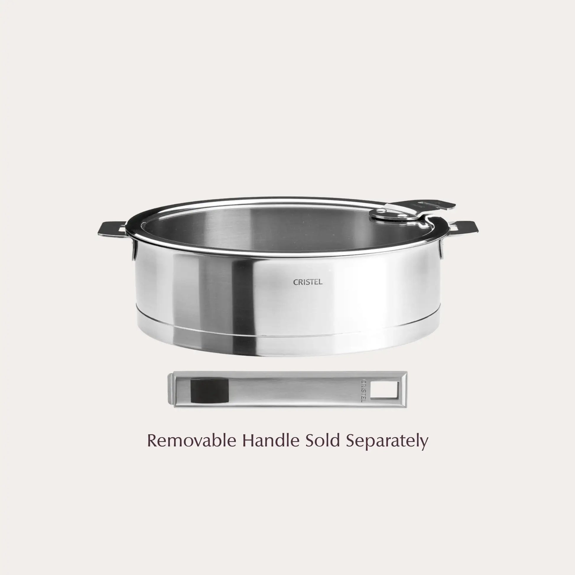 Thanks to the efficiency of their CRISTEL® L Shape thermo-diffuser base, compatible with induction, the Strate®Detachable handle system fits all kitchen sizes and will be a valuable ally for all your culinary preparations. Practical, the detachable handle system makes it possible to transform your stainless steel vessel into a serving dish by replacing the long handle with short handles.