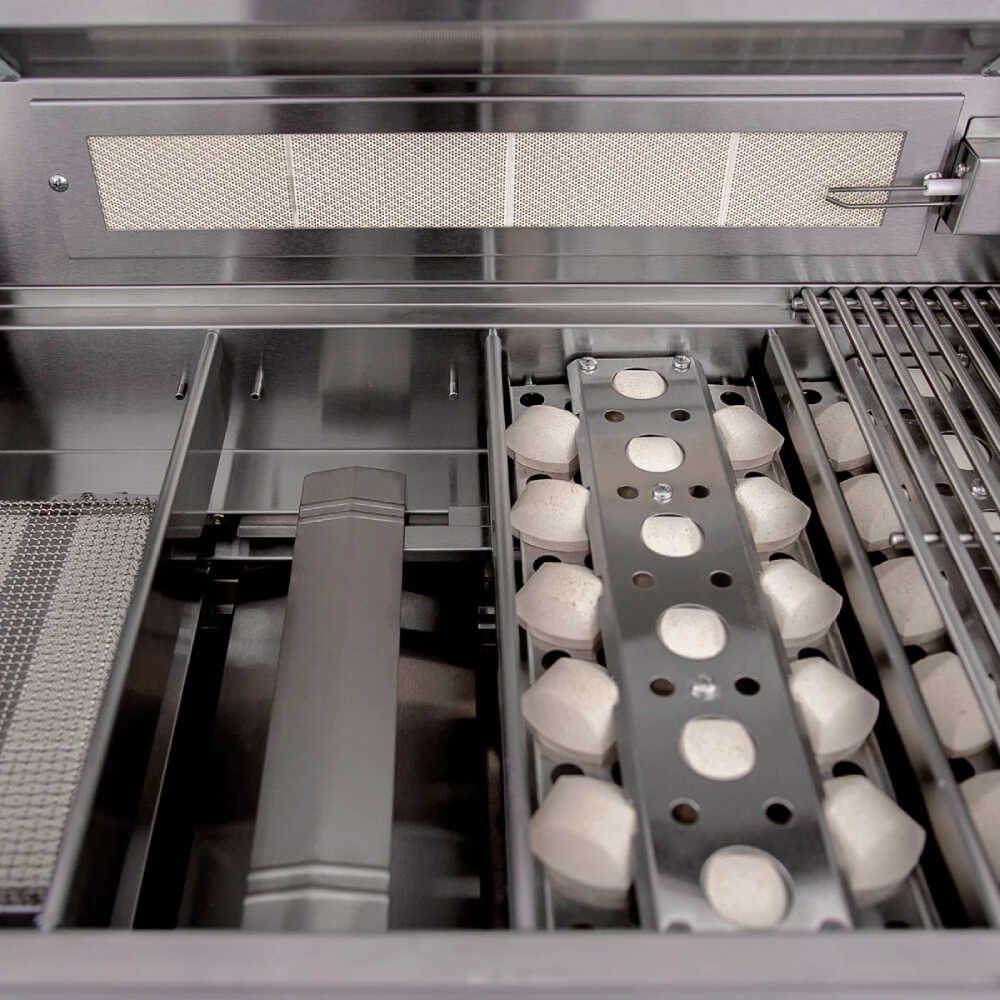 Premium 8mm thick stainless steel grates provide a professional searing surface, while the double-lined hood with interior lighting ensures optimal cooking conditions.