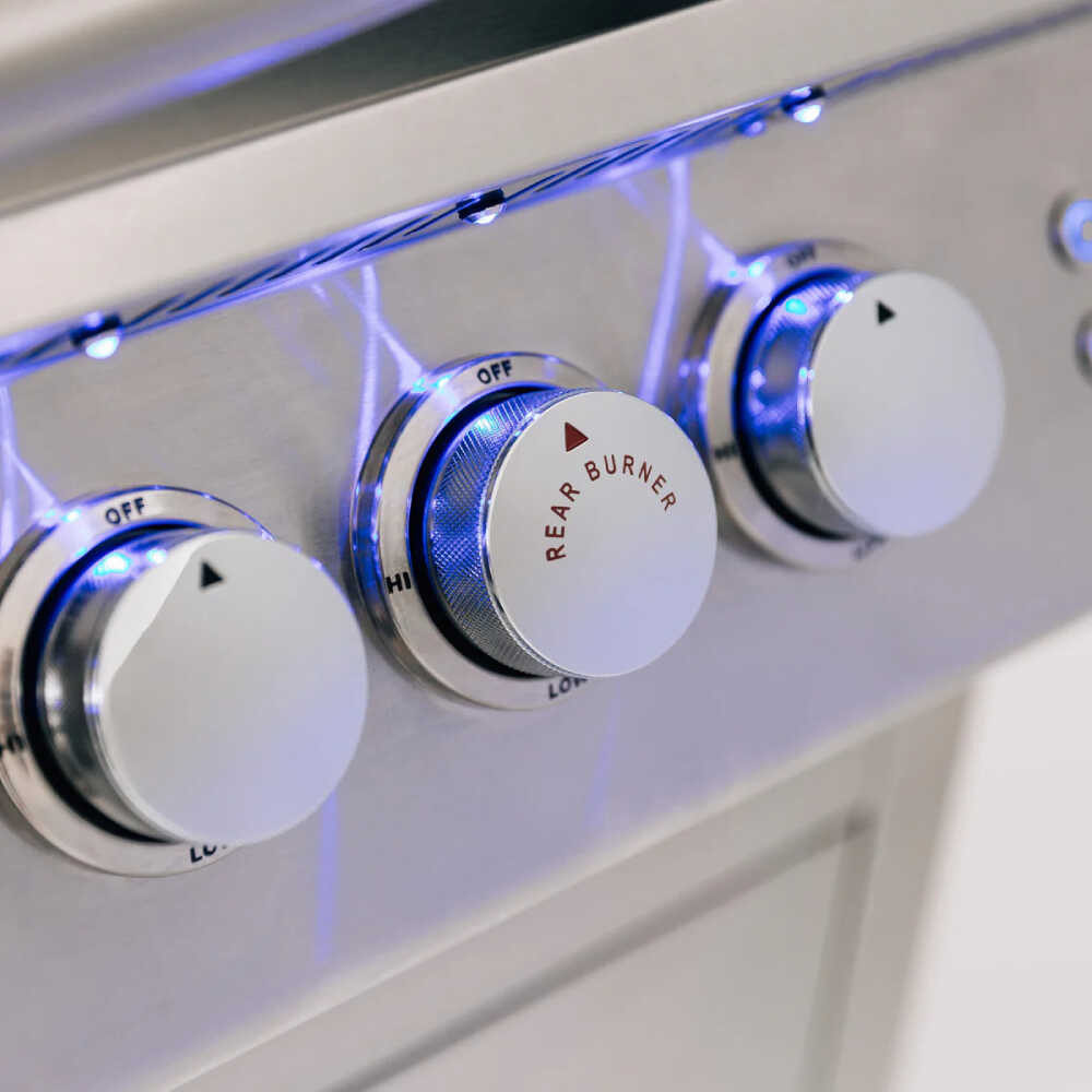 - Built with 443 stainless steel construction, this grill is designed to last and withstand the elements. The sleek exterior LED lights and double-lined hood with interior cooking lights add both functionality and style to your outdoor kitchen.